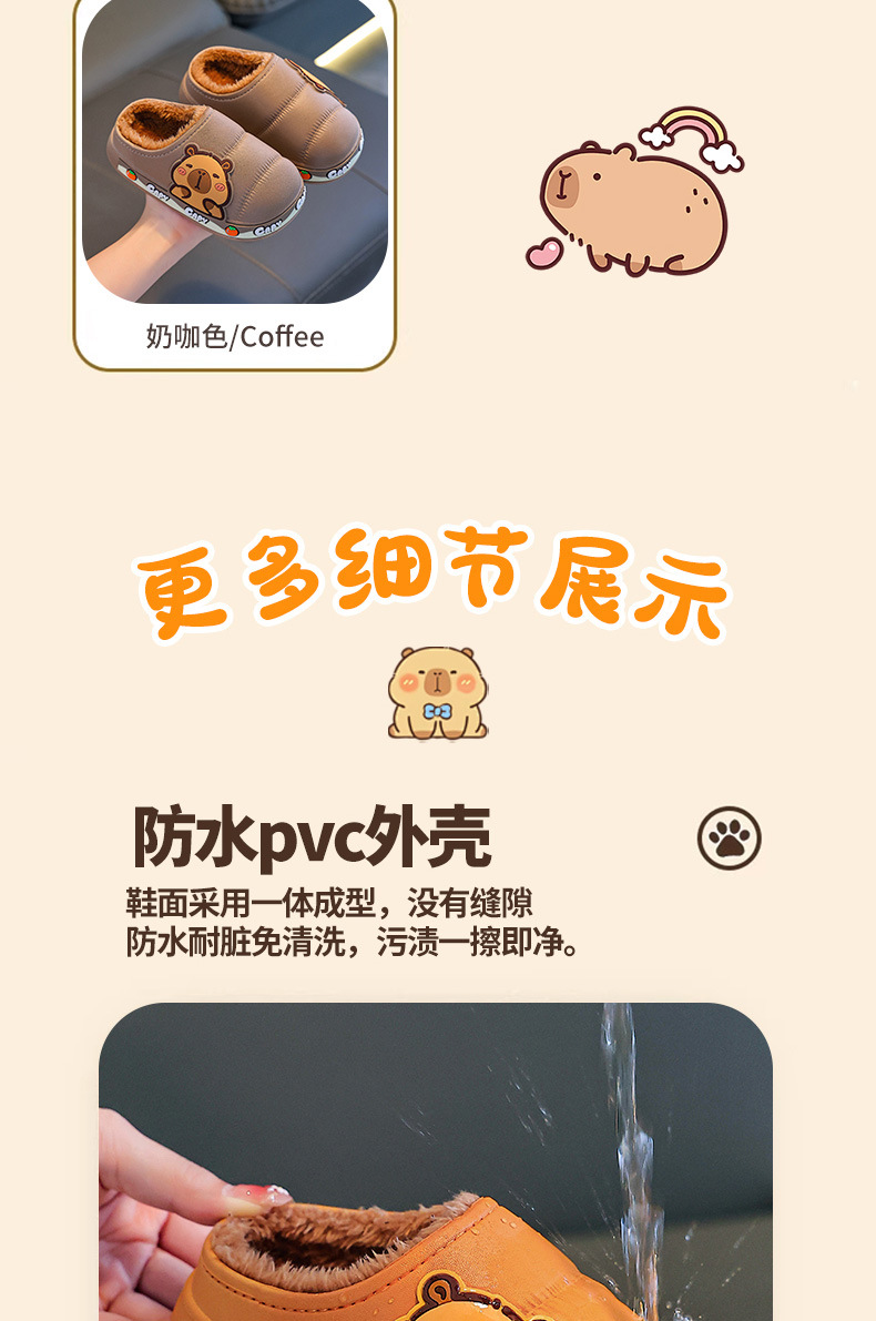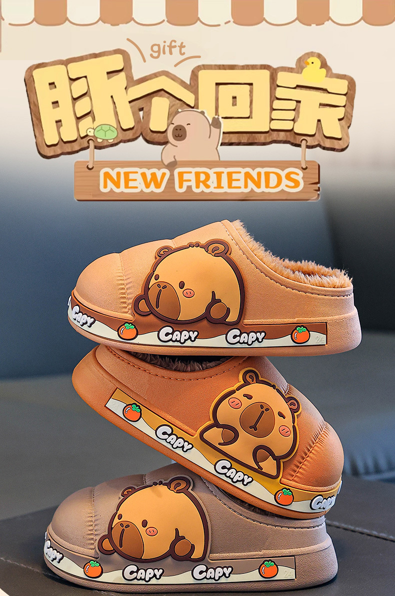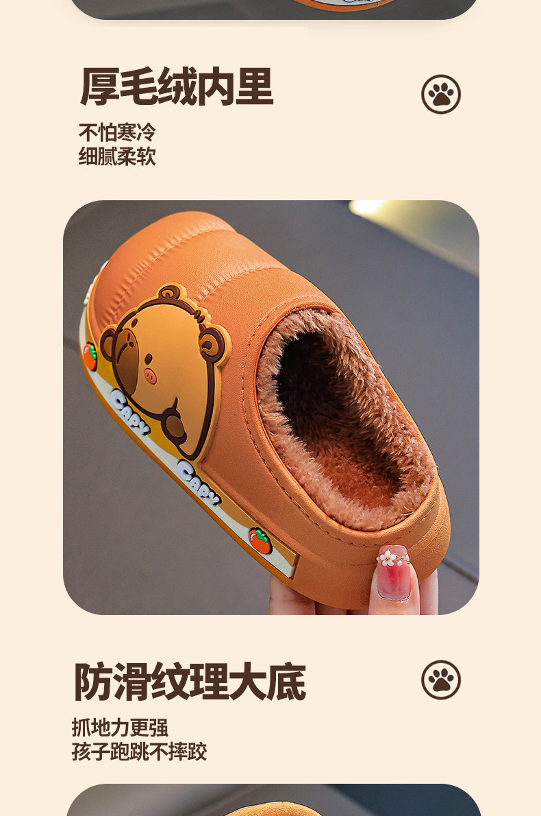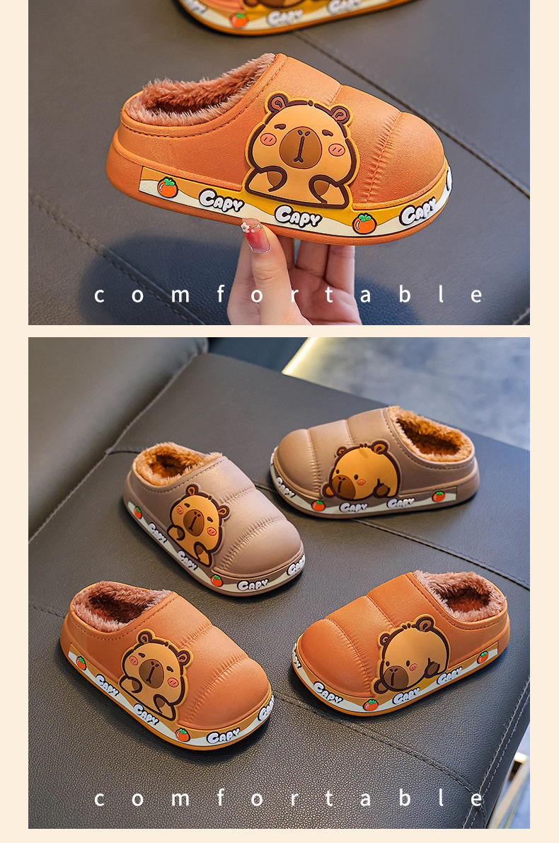 Zapatillas de algodón de invierno para niños Capibara, calentamiento y terciopelo impermeable, zapatos de algodón para niños mayores, lindos paquetes de tacones para niños en casa.