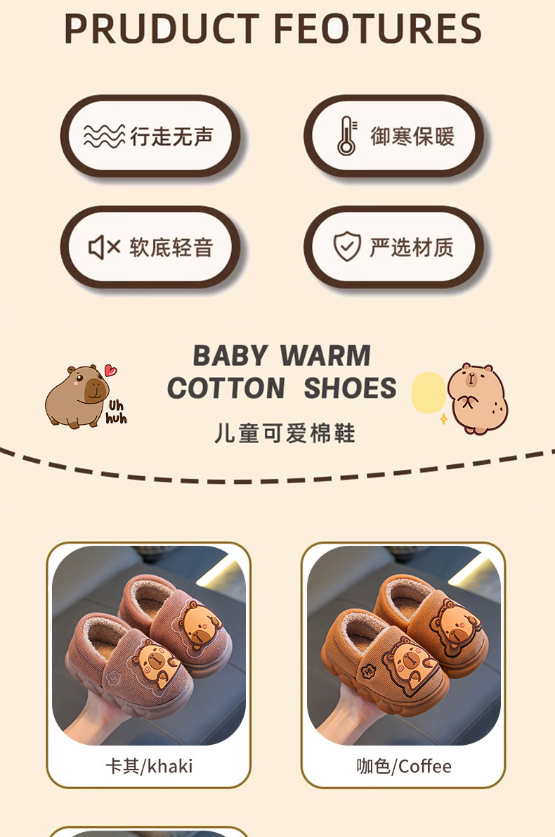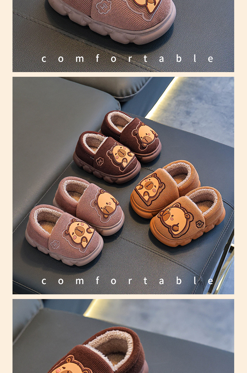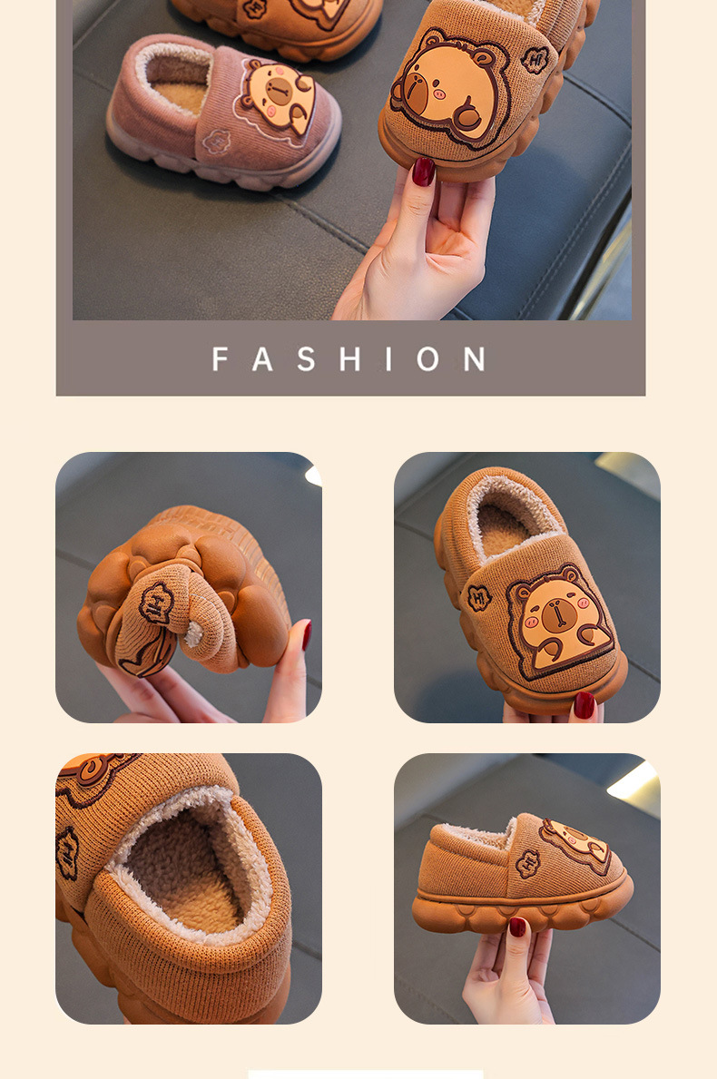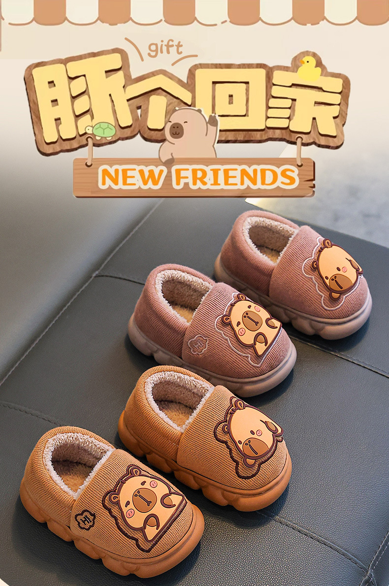 Capibara invierno zapatillas de algodón para niños, calentamiento y pelusa de fondo grueso, zapatos de algodón para niños de tamaño medio y grande.