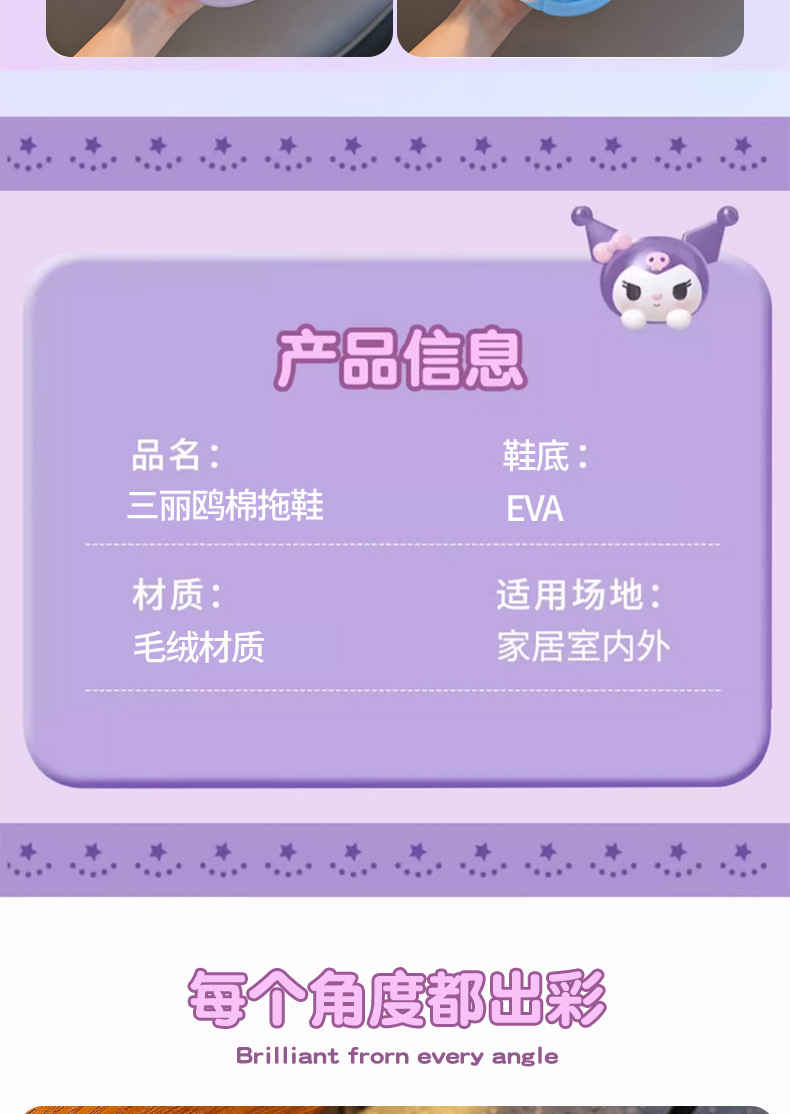 | Color | Zapatillas Colomi púrpura, zapatillas Melody rosa, zapatillas de perro de orejas azules, zapatillas de Kitty rojas, Colomi púrpura (talón de bolsa), Melody rosa (talón de bolsa), perro de orejas azules (talón de bolsa), Kitty roja (talón de bolsa) |