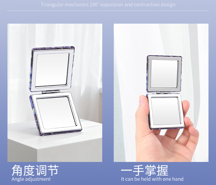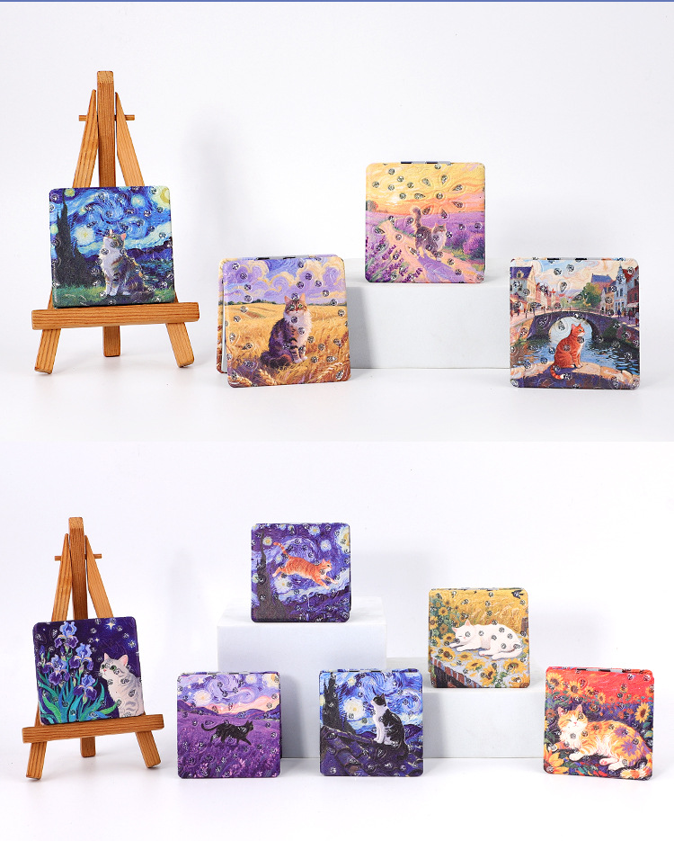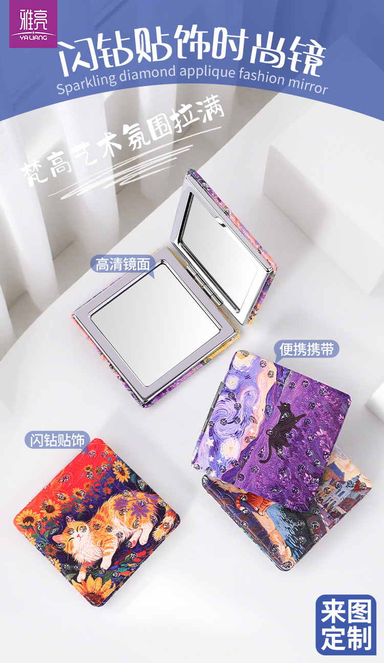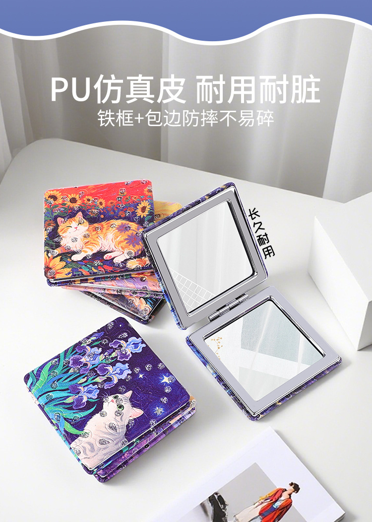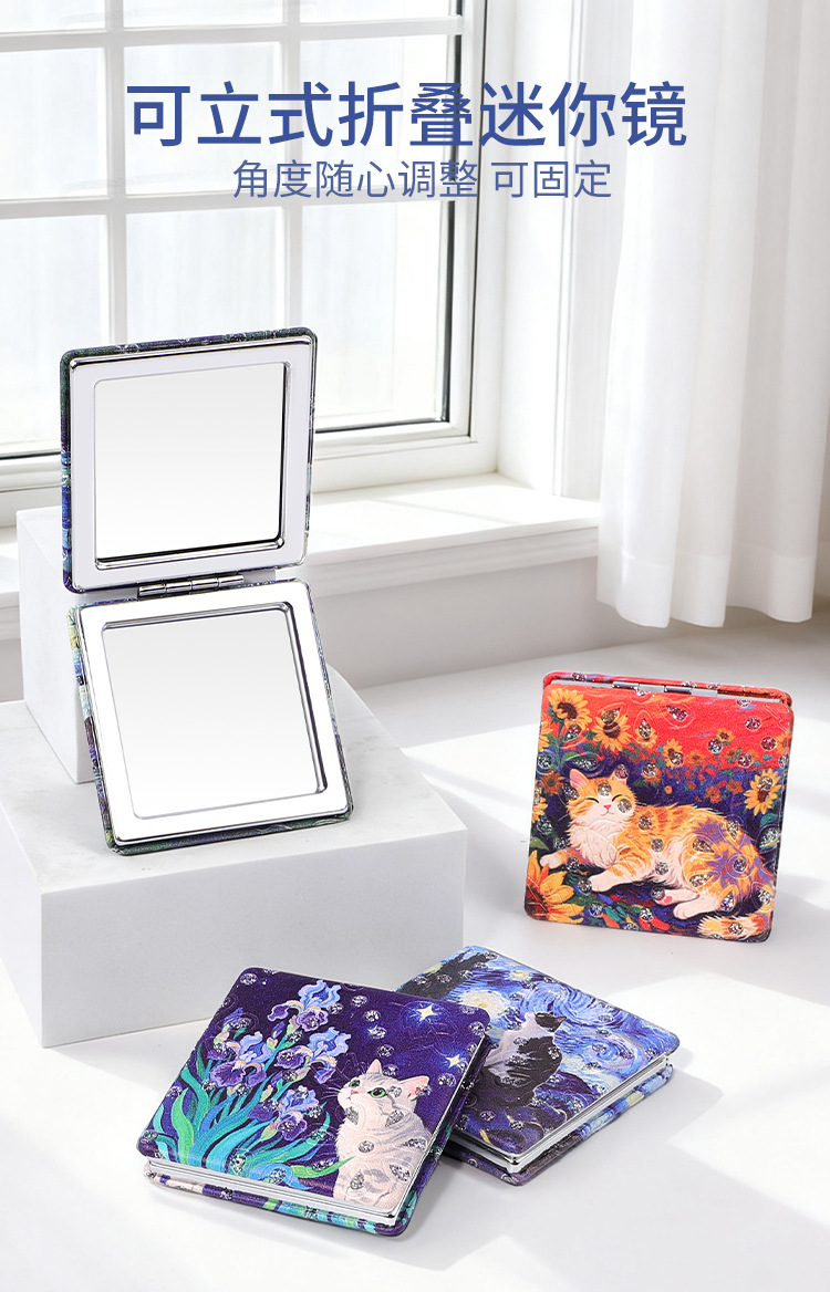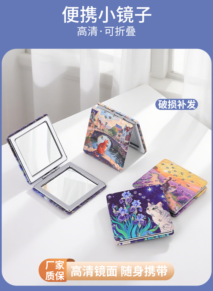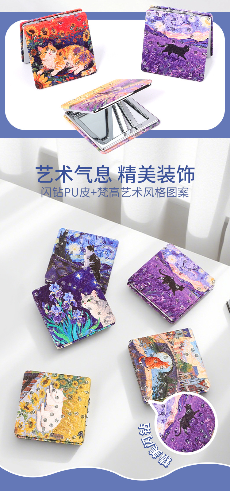 Ins viento flash perforación de piel pintura al óleo estrellado gato portátil doble espejo plegable espejo maquillaje para personalizar