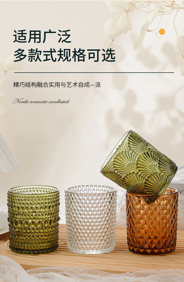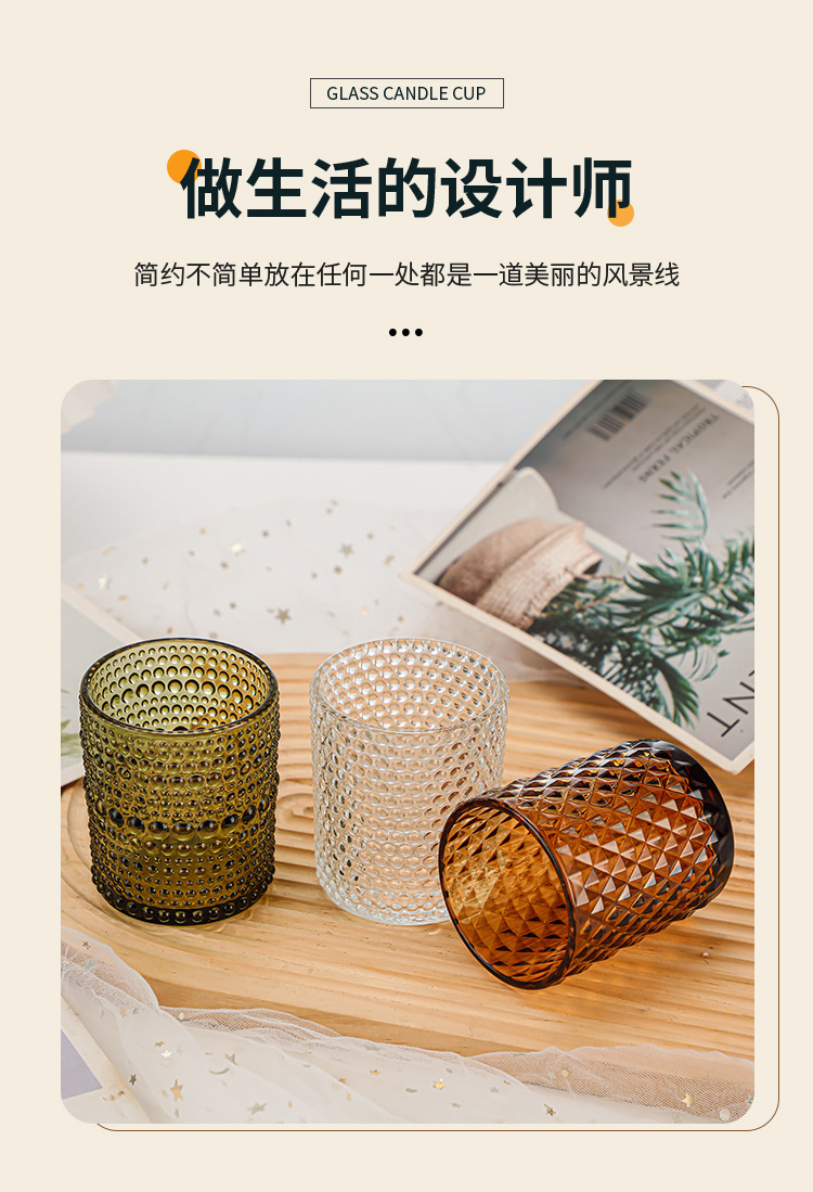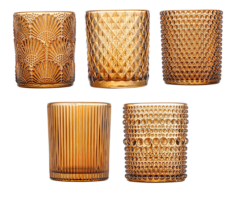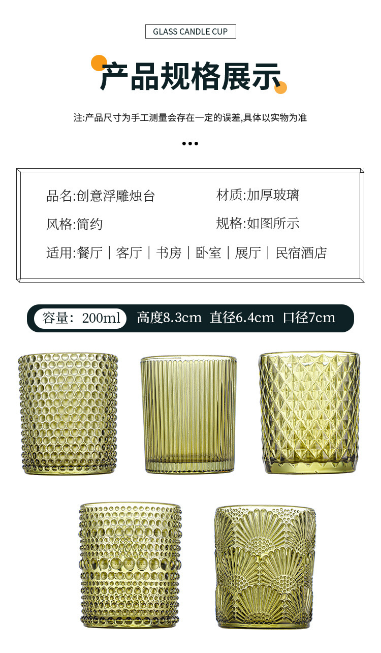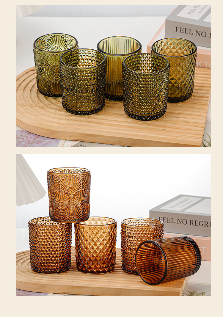 Vaso de vidrio de colores en stock, vaso de vidrio con relieve para velas, vaso de vidrio con rayas ámbar, vaso de vidrio con patrones verdes en stock