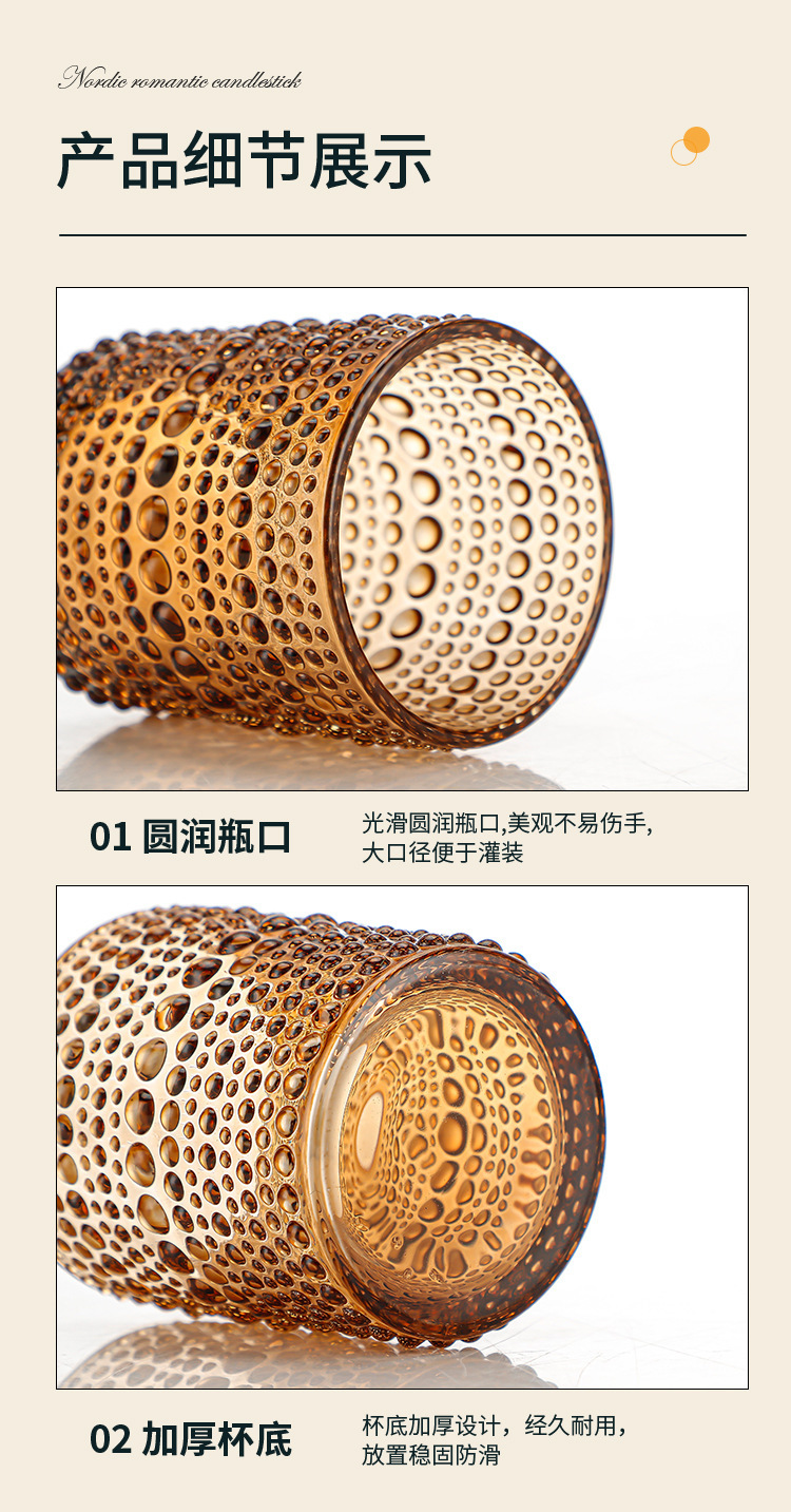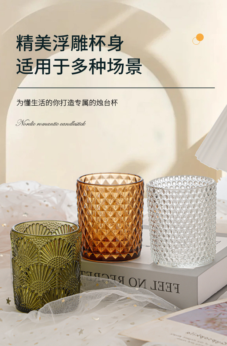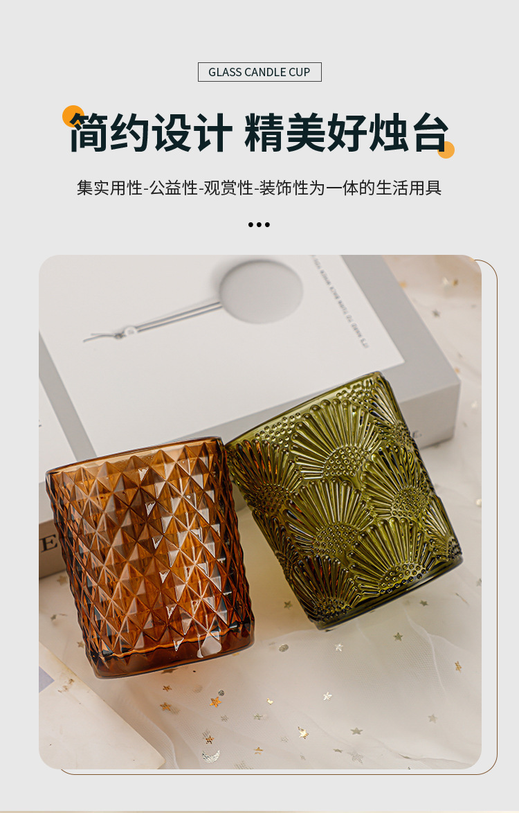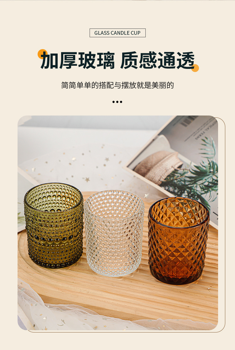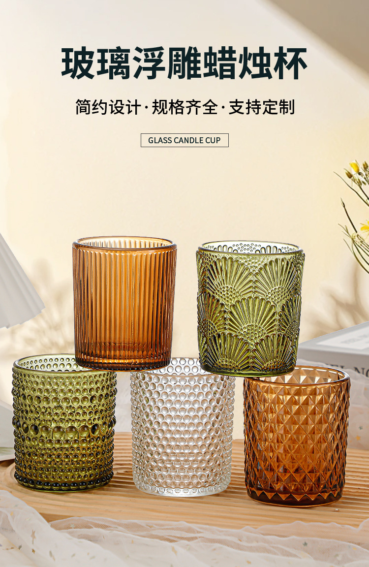 Vaso de vidrio de colores en stock, vaso de vidrio con relieve para velas, vaso de vidrio con rayas ámbar, vaso de vidrio con patrones verdes en stock
