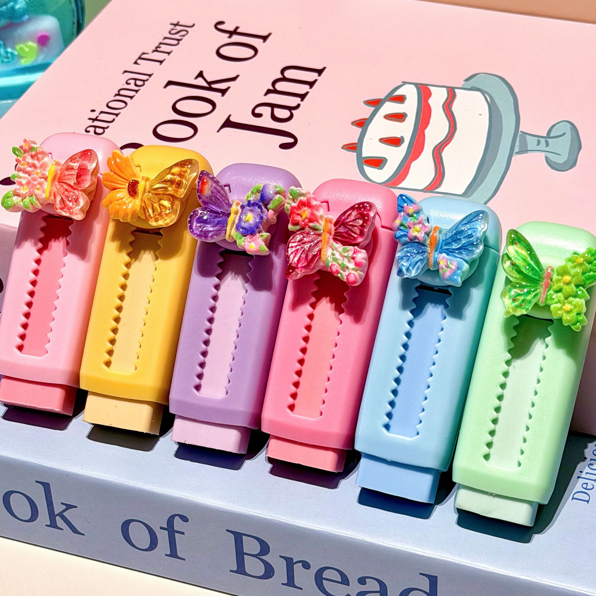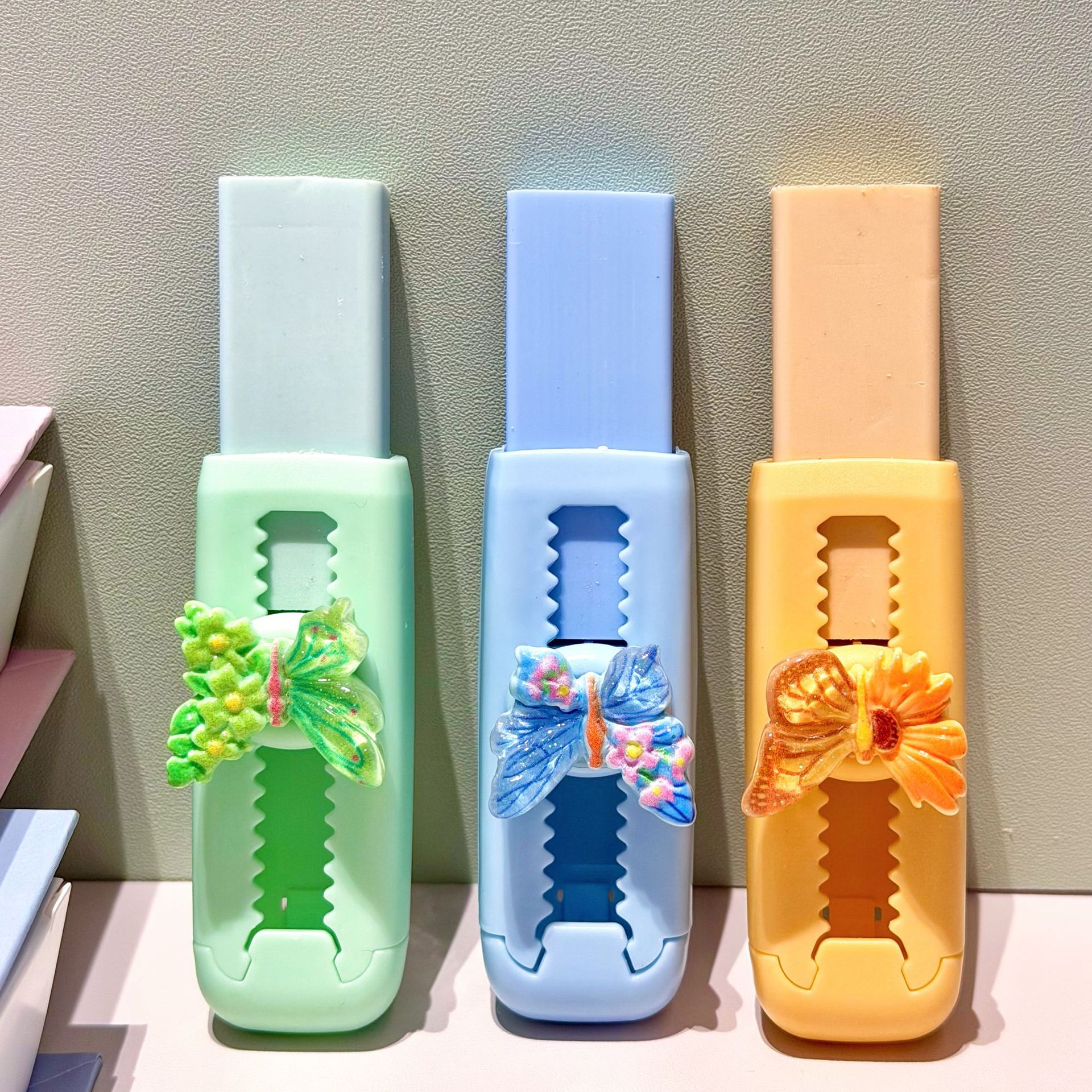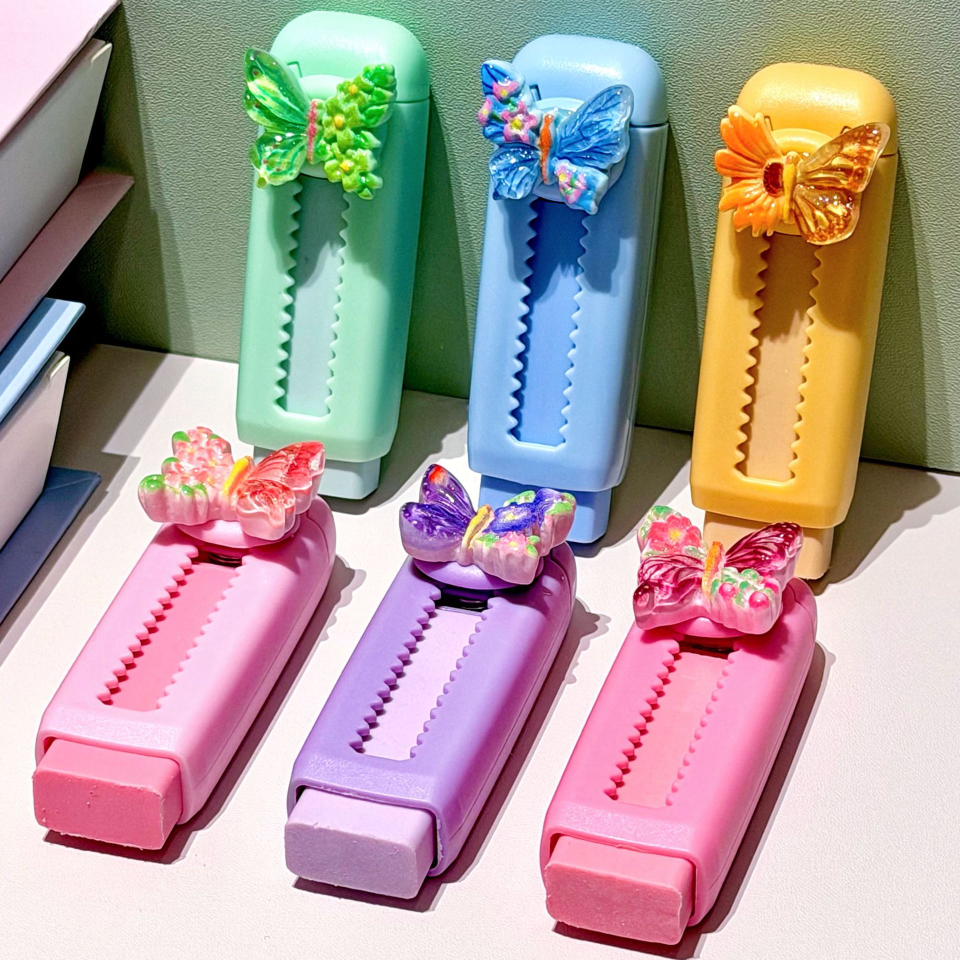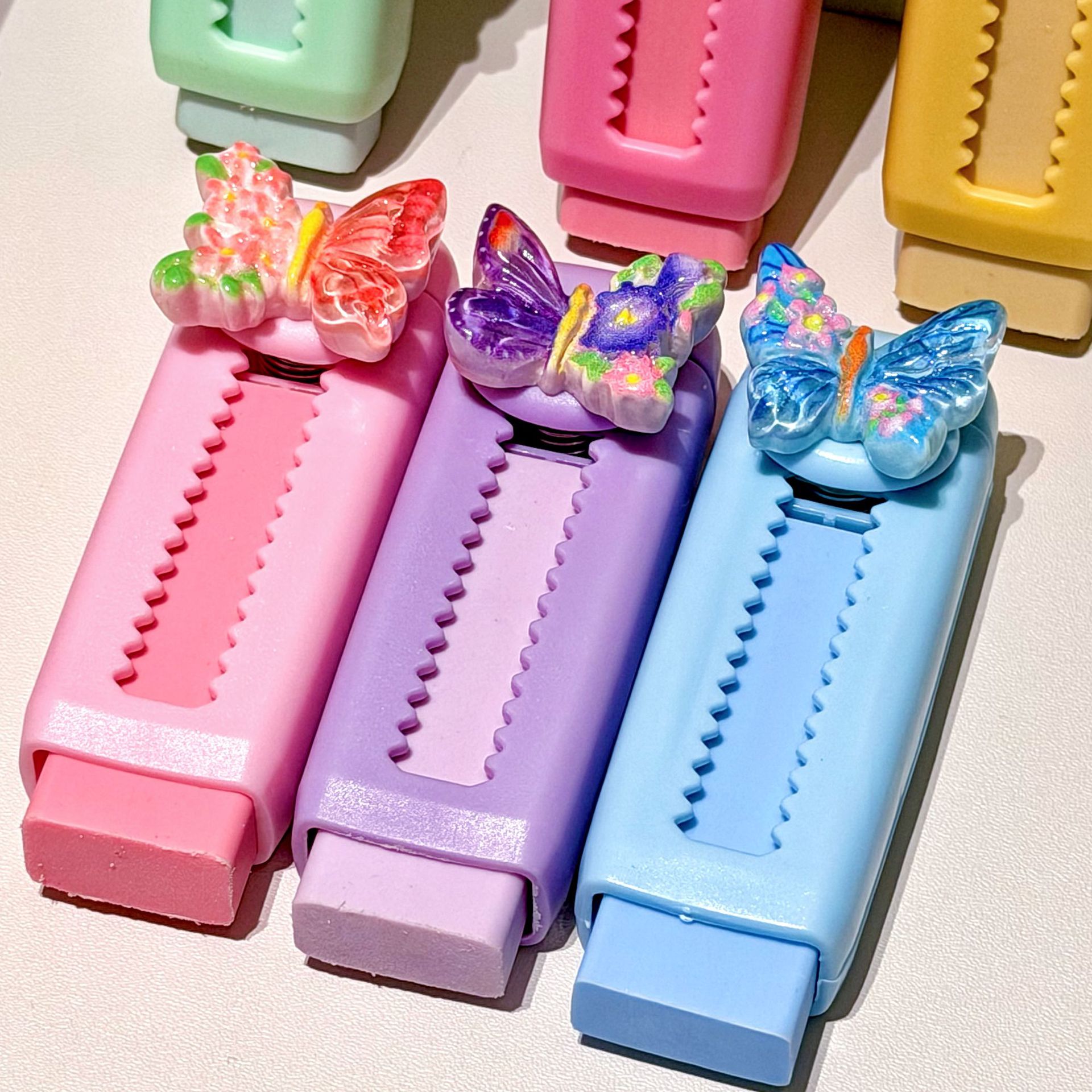 Papelería de dibujos animados de color mariposa empujando y tirando borradores de lápiz limpio borradores de lápiz limpio borradores de lápiz limpio