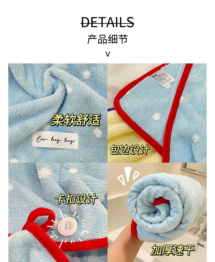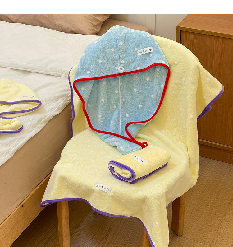 | Color | Toalla de baño azul, sombrero seco azul, toalla azul, toalla de baño amarilla, sombrero seco amarillo, toalla amarilla |