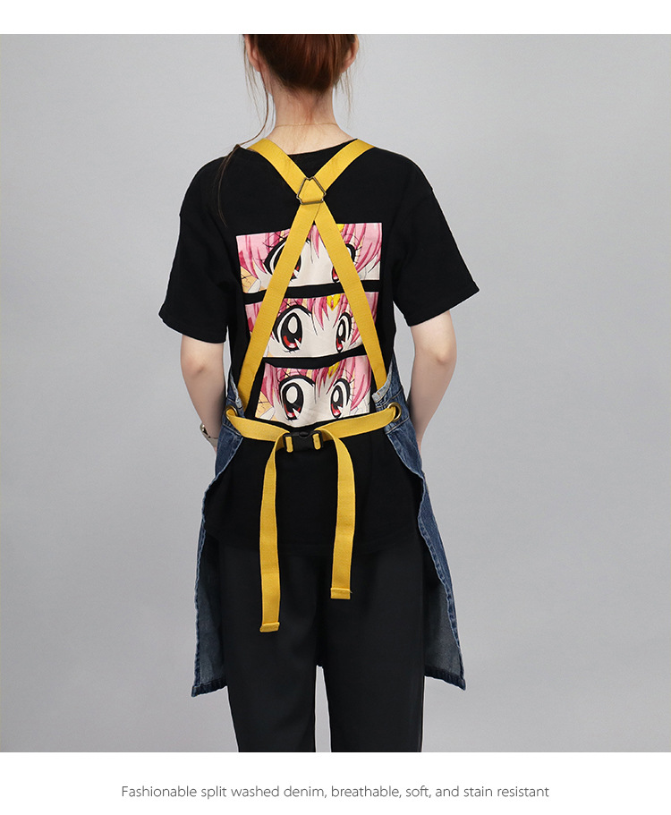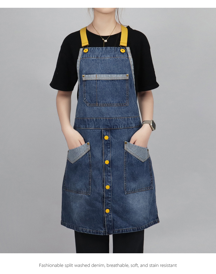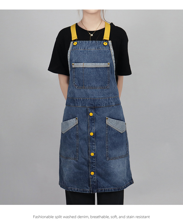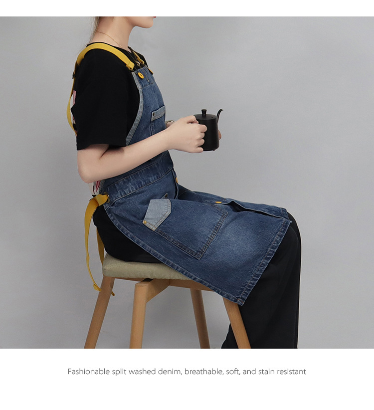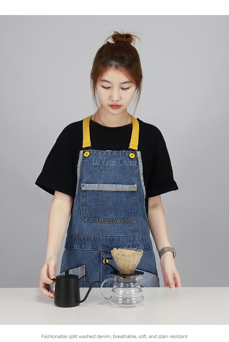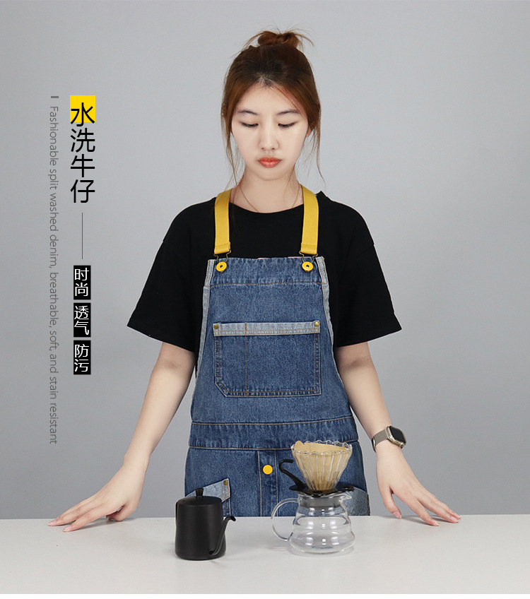 Comercio exterior agua lavada denim delantal barbero tostador café jardinería restaurante ropa de trabajo nuevo delantal de moda de color contraste