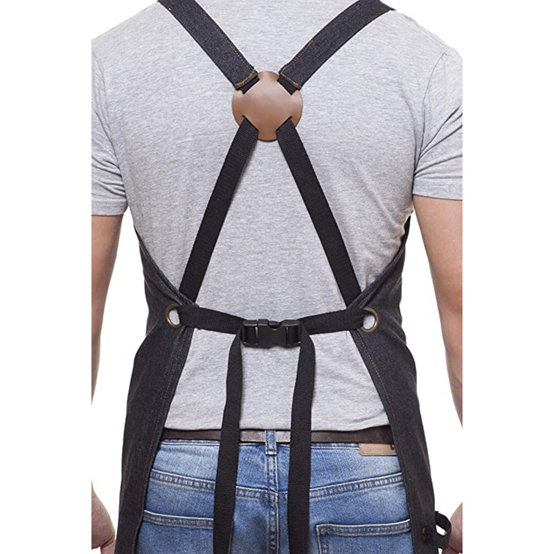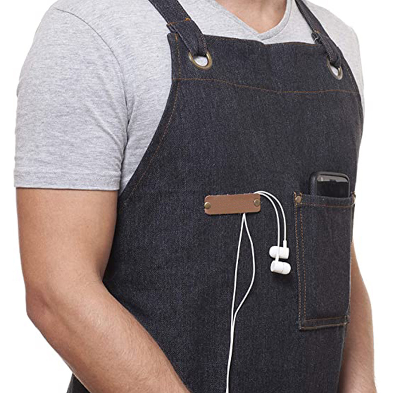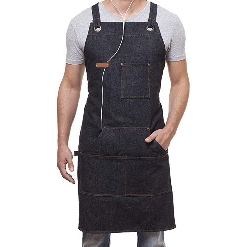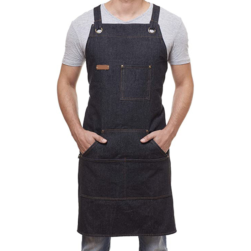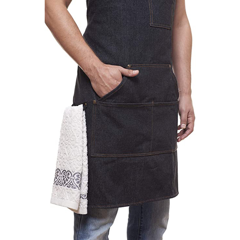 Comercio exterior de mezclilla delantal logotipo personalizado parrilla cafetería jardinería peluquero cocina guardapolvos delantal al por mayor