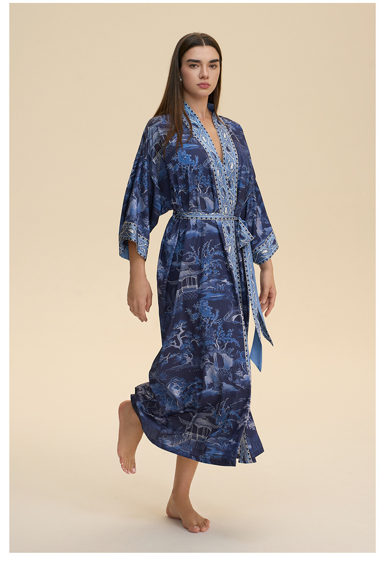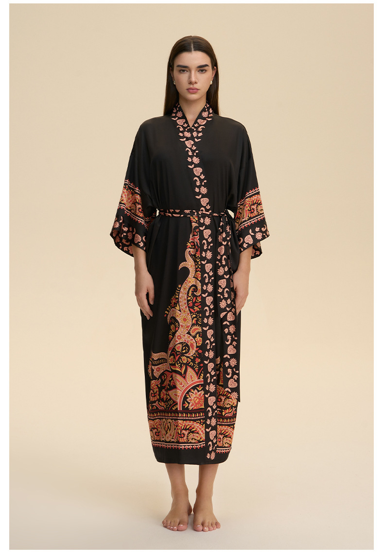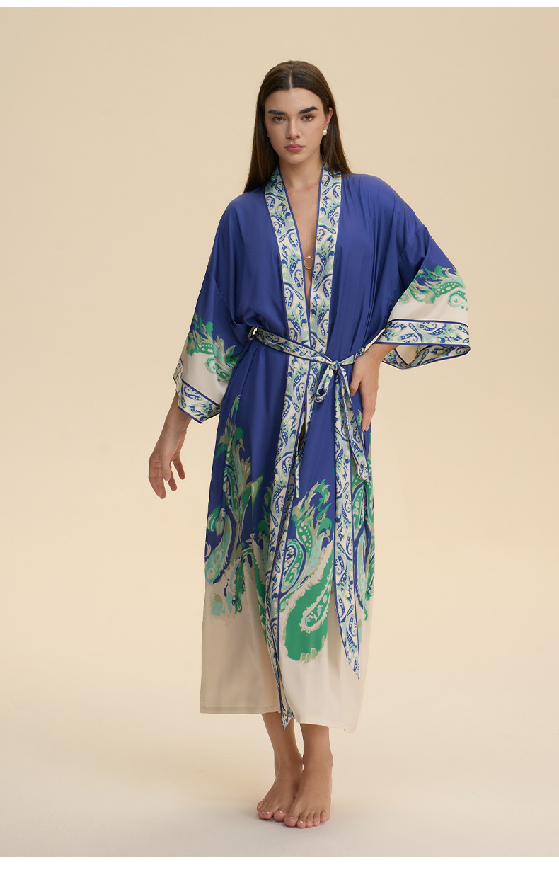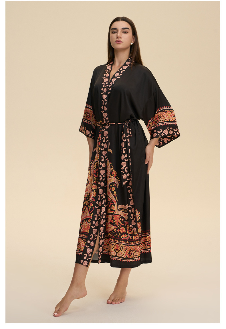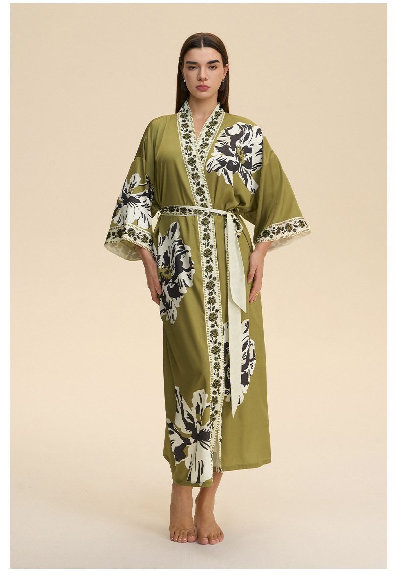 Nuevo europeo y americano transfronterizo larga manga larga larga larga suelta y cómoda kimono ropa de cama impresa para mujeres WP3982