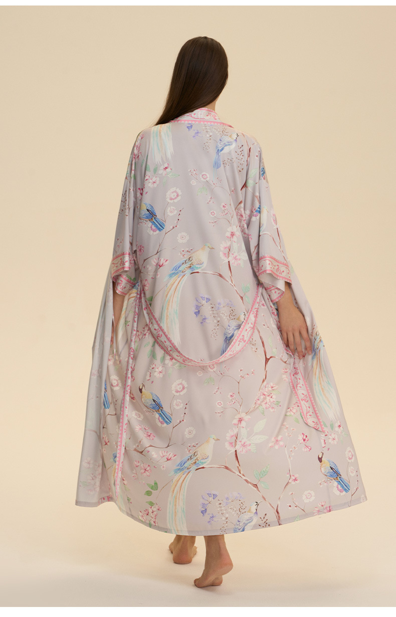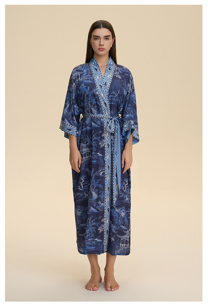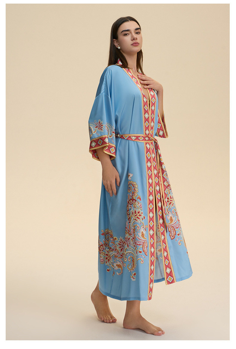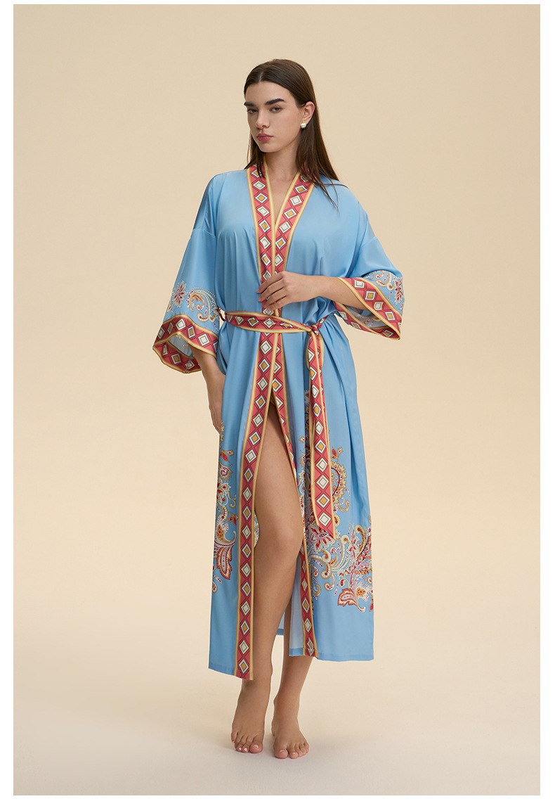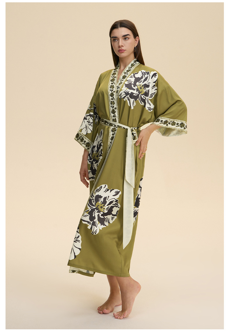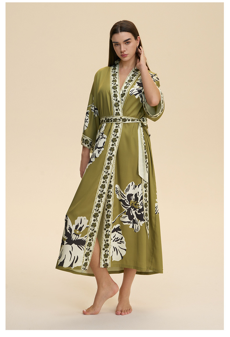 Nuevo europeo y americano transfronterizo larga manga larga larga larga suelta y cómoda kimono ropa de cama impresa para mujeres WP3982