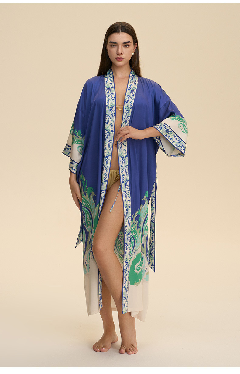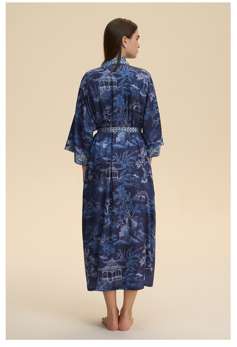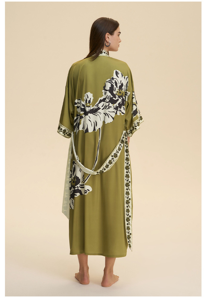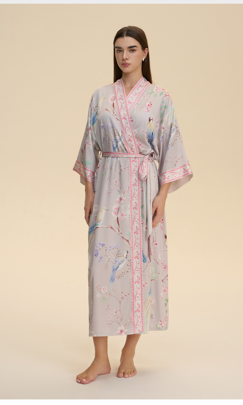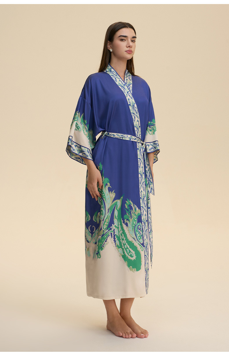 Nuevo europeo y americano transfronterizo larga manga larga larga larga suelta y cómoda kimono ropa de cama impresa para mujeres WP3982