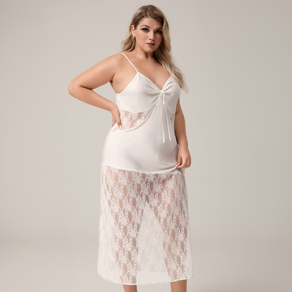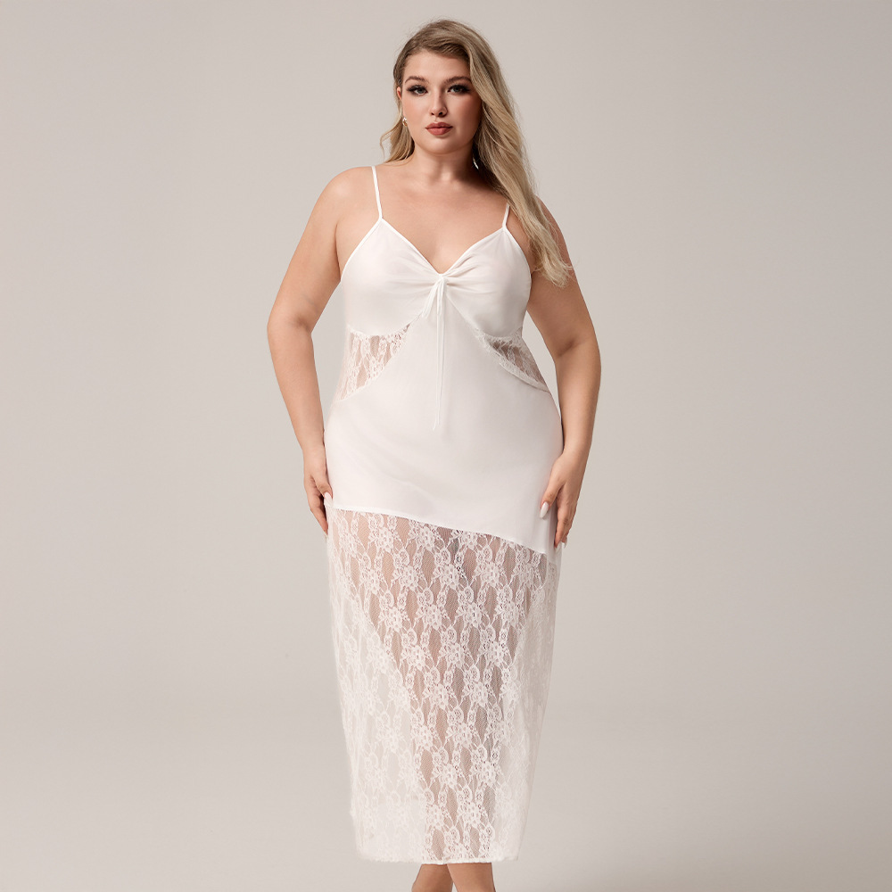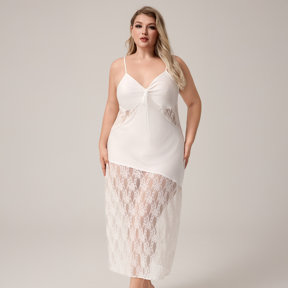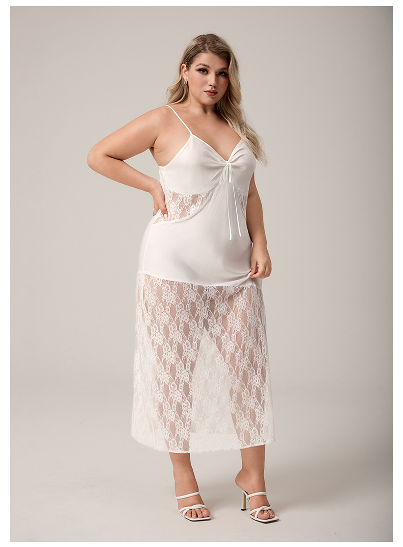 Yaoting nuevo pijama de seda de hielo de tamaño grande europeo y americano, encaje de empalme, vestido de pijama de mujer largo sexy SQ7004