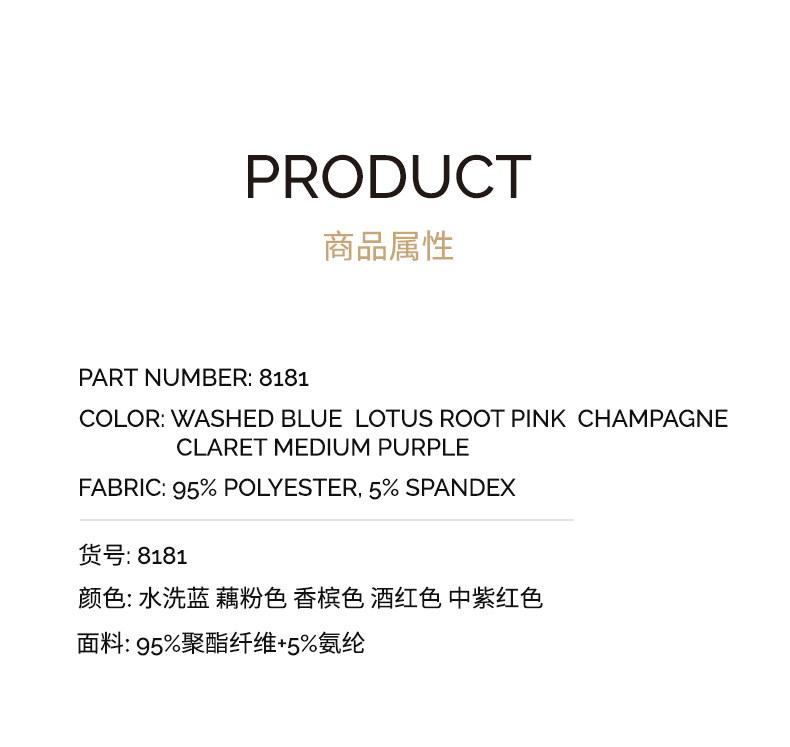 | Color | Rojo vino, rojo púrpura medio, champán, azul lavado, polvo de raíz de loto |
