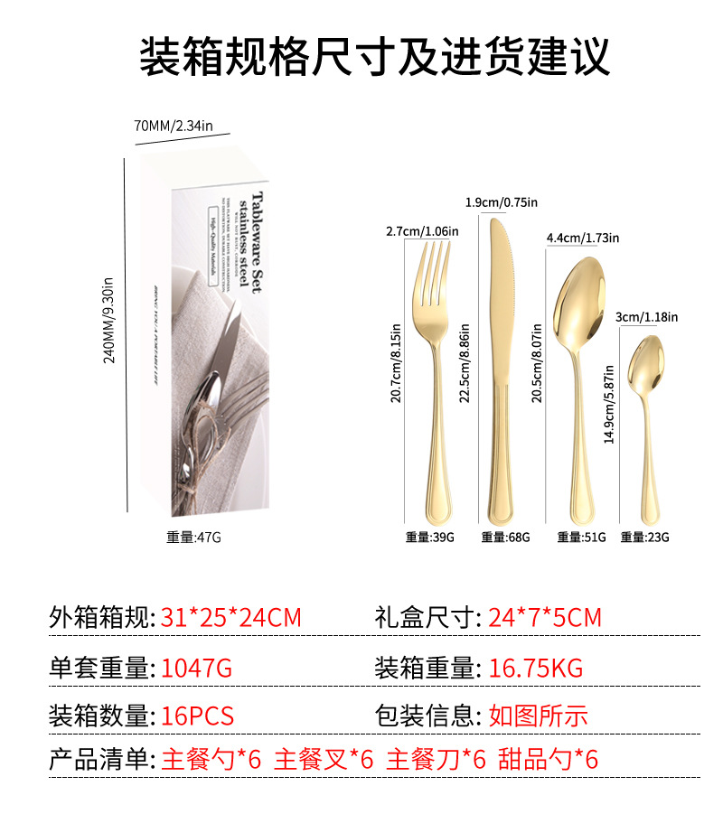 Cuchillo y tenedor de acero inoxidable, cuchillo y tenedor de comercio electrónico transfronterizo, set de 24 piezas, set de doble línea de cubiertos de comida occidental, set de caja de regalo