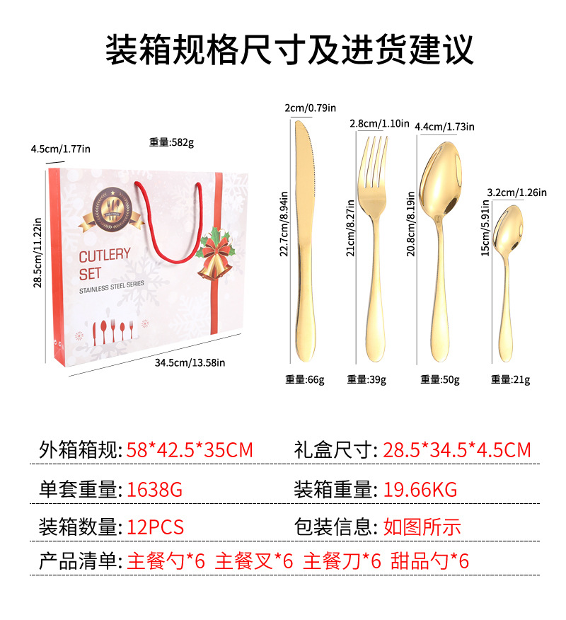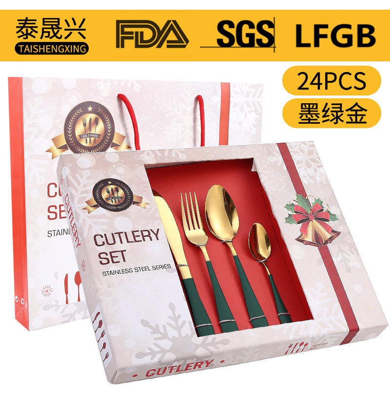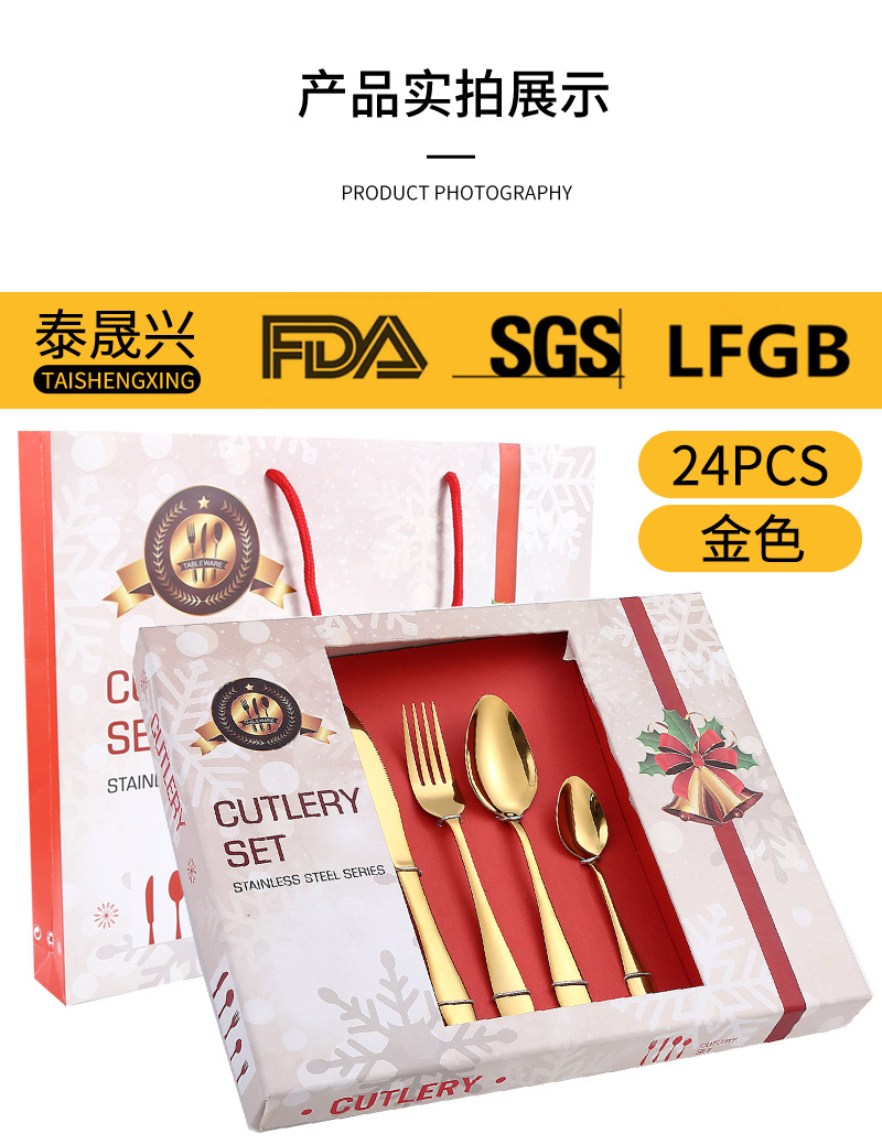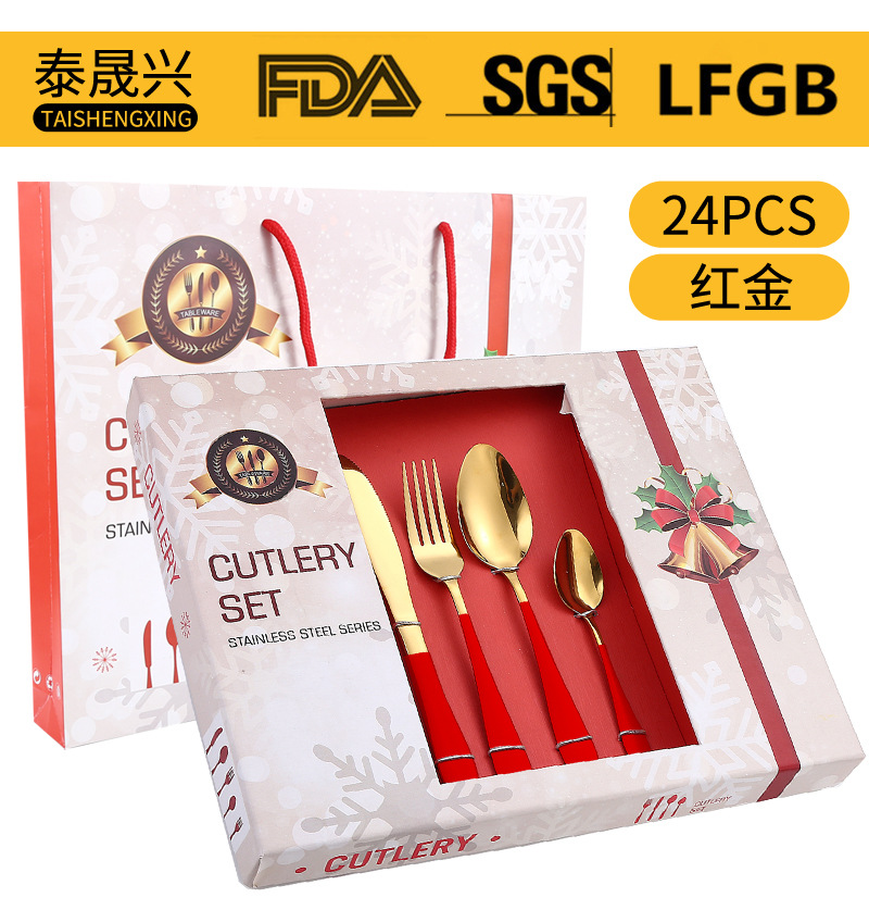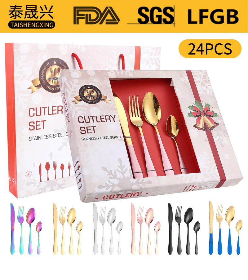 Amazon popular vajilla de acero inoxidable 24 piezas traje 1012 cuatro piezas principales cuchillo de comida occidental, tenedor y cuchara traje de caja de regalo de Navidad