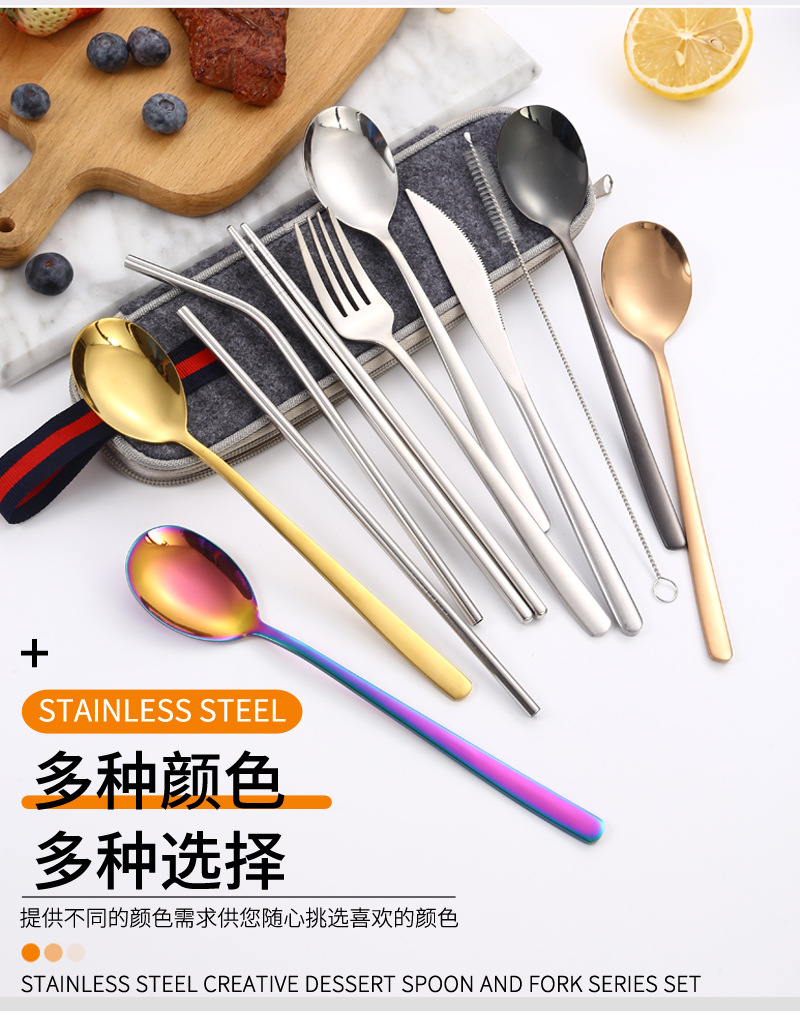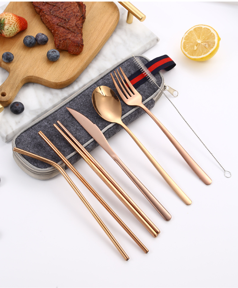 Amazon popular 304 Acero inoxidable paja vajilla traje coreano cuchillo de comida occidental, tenedor y cuchara de paja portátil conjunto de 7 piezas