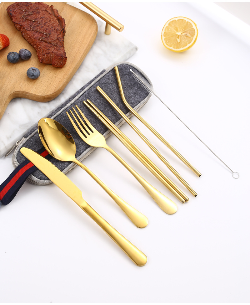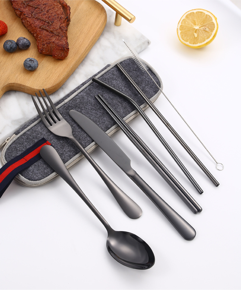 Amazon producto caliente de acero inoxidable vajilla paja traje 1010 cuchillo de comida occidental, tenedor y cuchara de paja portátil de 7 piezas conjunto
