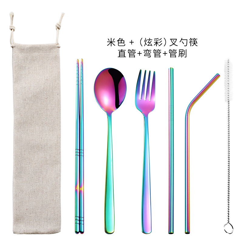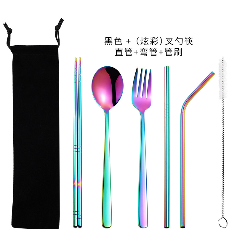 Venta caliente transfronteriza 304 paja de acero inoxidable vajilla portátil creativo chapado en oro palillos coreanos cuchara tenedor paja 7 piezas traje
