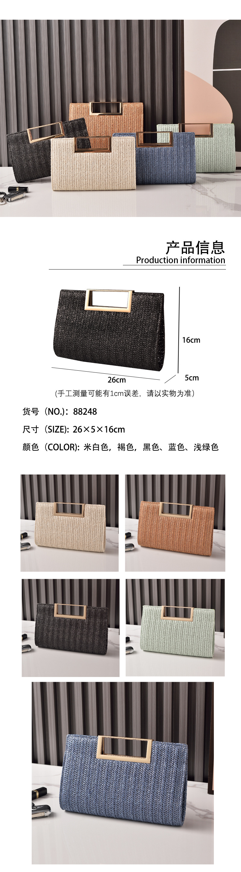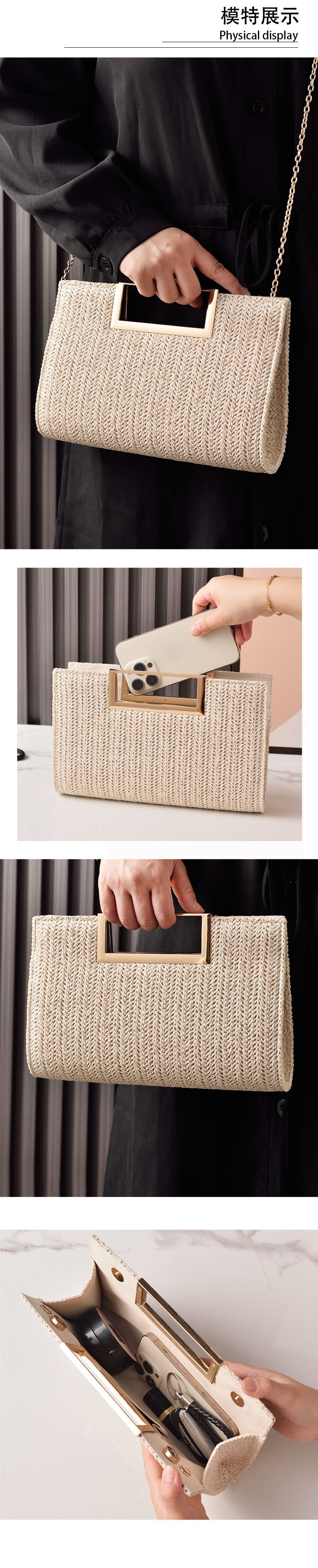 2025 nuevo bolso tejido de paja transfronterizo exclusivo, embrague de hardware con hebilla cuadrada de alta gama, bolso de cena simple europeo y americano, bolso de color sólido