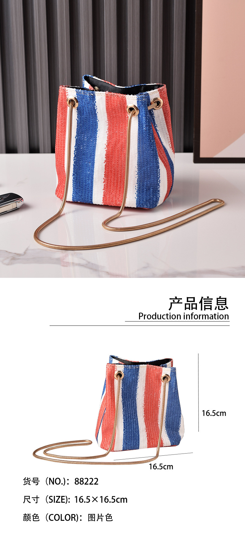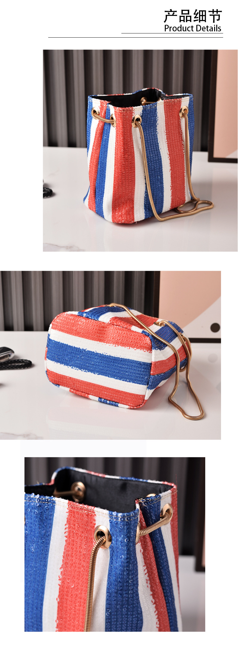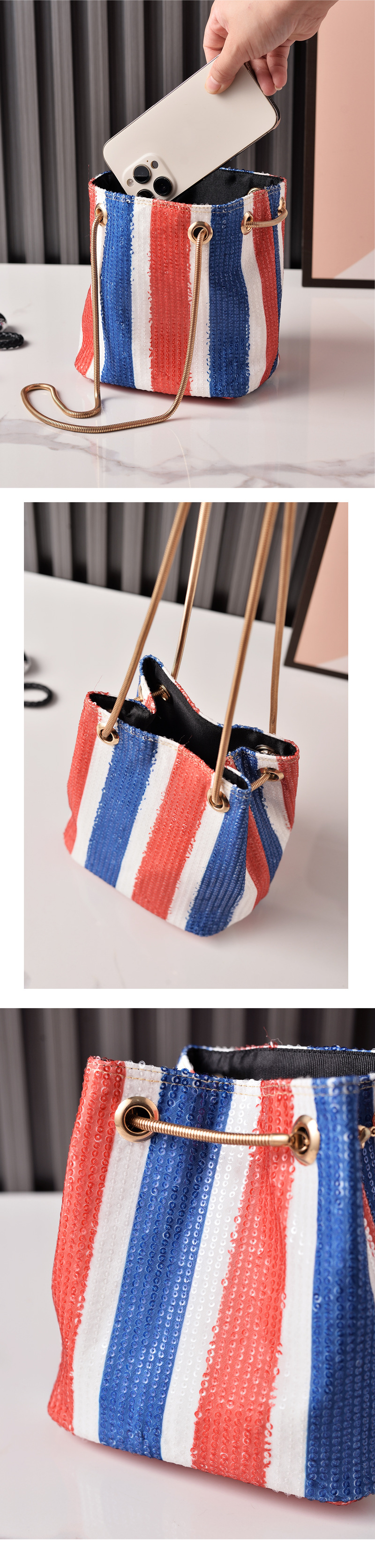 Bolsa de cubo de moda retro sequilla cadena bolso de mujer rojo, azul y blanco rayas bolso de hombro de mujer fábrica directa bolso transfronterizo
