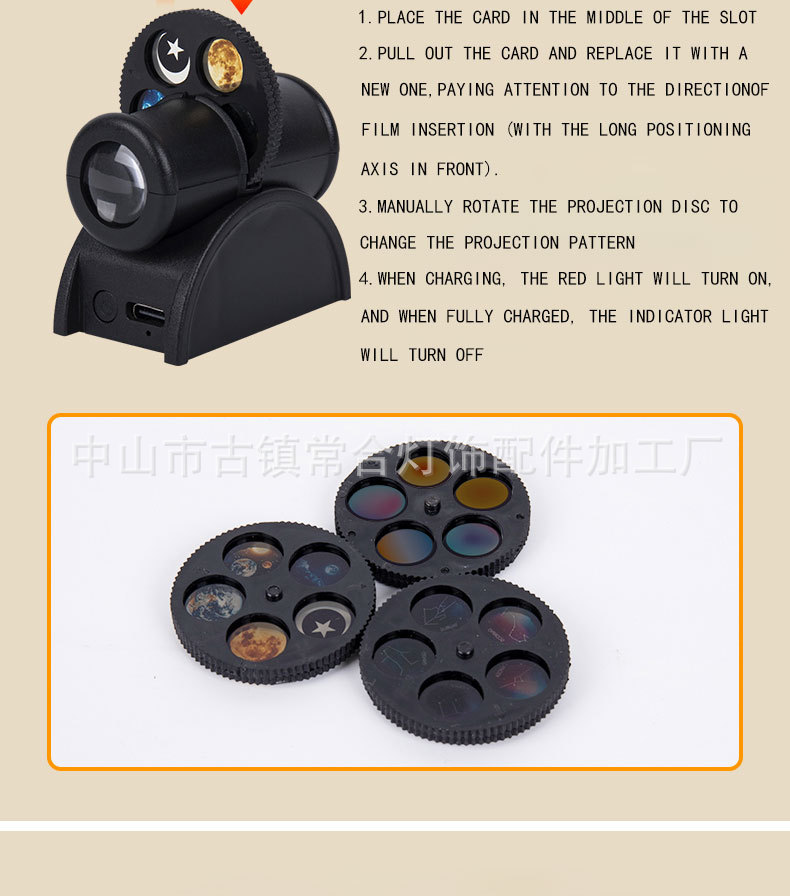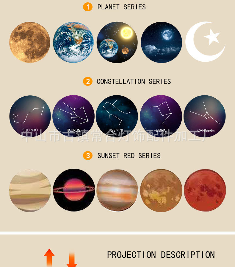 | Colores de luz | 15 efectos de proyección de una lámpara,Película de diapositivas de la serie Earth and Moon (sin luz para una sola película),Película de diapositivas de la serie Planet (sin luz para una sola película),Hoja de diapositivas de la serie Constellation (sin luz para una sola diapositiva) |