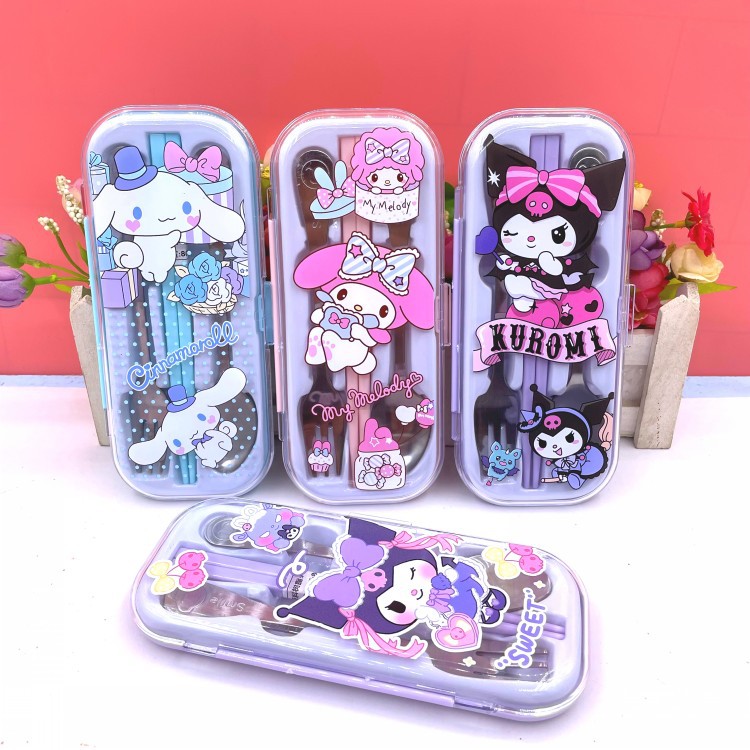 Cute portátil Kulomi Yue Gui perros niños estudiantes palillos de acero inoxidable tenedor palillos set cubiertos set box