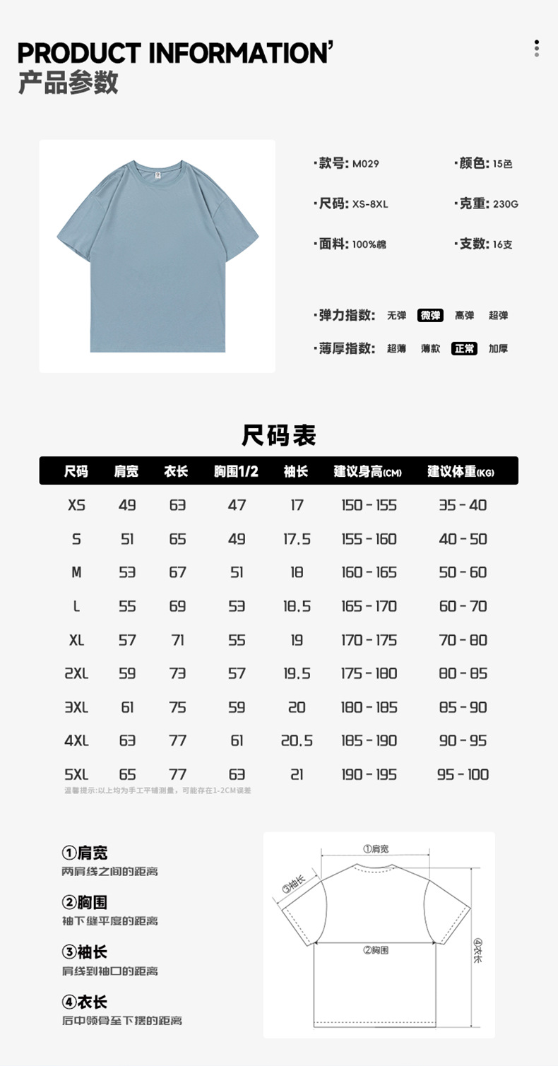 Gris claro azul M029 [Algodón de fibra larga de Xinjiang con hombros caídos]