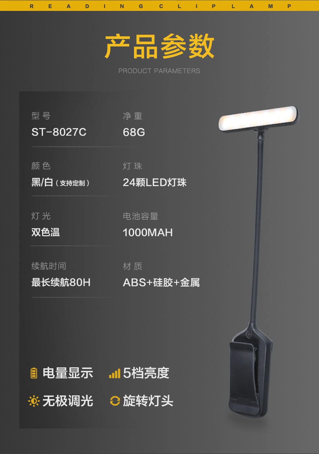 Nueva lámpara de lectura rotativa 24LED, lámpara de clip de libro de protección ocular, lámpara de mesa pequeña de carga USB, lámpara de clip de libro de larga duración transfronteriza