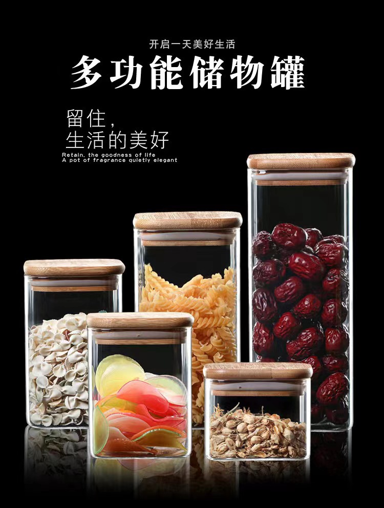 Tanque de almacenamiento de vidrio sellado cuadrado, tanque de té fresco, tanque de almacenamiento de granos, tanque de dulces, tanque de almacenamiento de vidrio de alto silicio