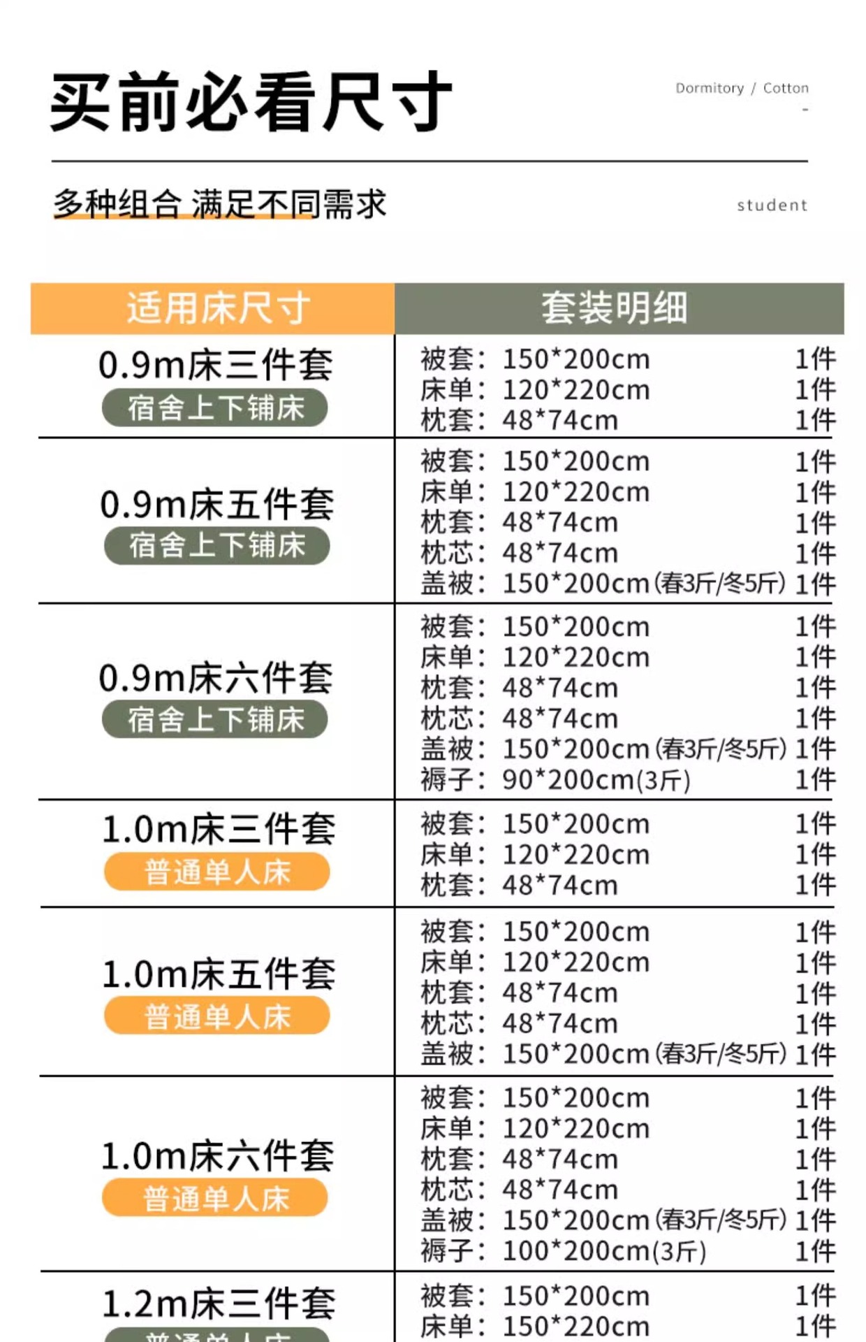 | Especificaciones de tamaño | Sábanas de cama de 0,9 m con tres piezas (colcha de colcha + sábanas + funda de almohada), cama de 0,9 m cama de tres piezas (colcha de colcha + cama + funda de almohada), sábanas de 1.2m cama con tres piezas (colcha de cama + sábanas + funda de almohada), sábanas de cama de 0,9 m con cuatro piezas [colcha de cama + sábanas + funda de almohada + núcleo de almohada], sábanas de cama de 0,9 m con cinco piezas de primavera y otoño [conjunto de tres piezas + núcleo de almohada + 3 <unk> edredón], sábanas de cama de 0,9 m con cinco piezas de otoño y invierno [conjunto de tres piezas + núcleo de almohada + 5 <unk> edredón], sábanas de cama de 0,9 m con seis piezas de primavera y otoño [conjunto de tres piezas + núcleo de almohada + 3 <unk> edredón + 3 <unk> colchón] para enviar paquetes de almacenamiento, Sábanas de 0,9 m cama otoño y invierno seis piezas [conjunto de tres piezas + núcleo de almohada + edredón de 5 <unk> + colchón de 3 <unk>] para enviar bolsa de almacenamiento, cama de 0,9 m cama primavera y otoño seis piezas [conjunto de tres piezas + núcleo de almohada + edredón de 3 <unk> + colchón de 3 <unk>] para enviar bolsa de almacenamiento, cama de 0,9 m cama otoño y invierno seis piezas [conjunto de tres piezas + núcleo de almohada + edredón de 5 <unk> + colchón de 3 <unk>] para enviar bolsa de almacenamiento. |