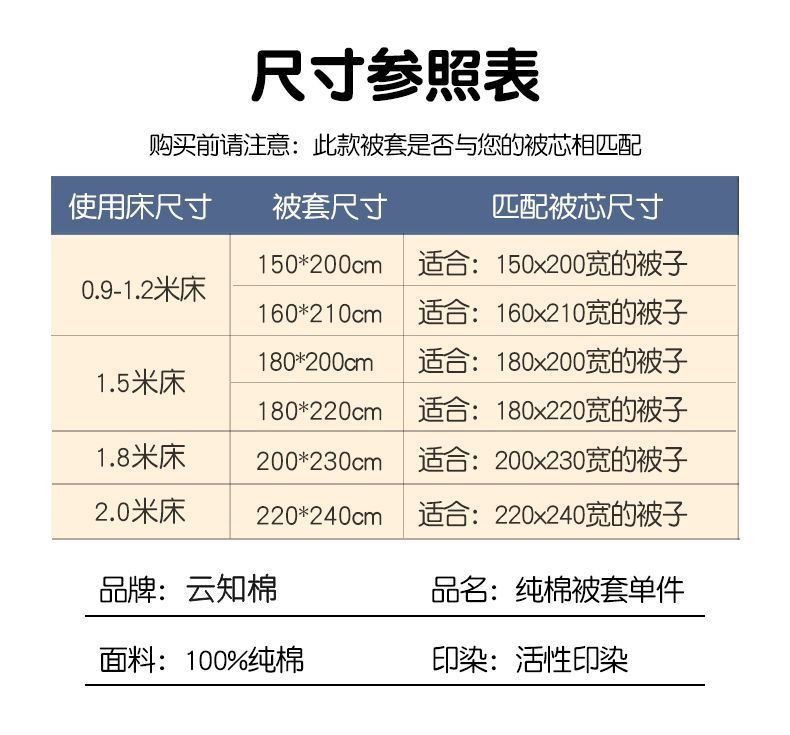 | Especificaciones de tamaño | 150x200cm [100% colcha de algodón una sola pieza], 160x210cm [100% colcha de algodón una sola pieza], 180x200cm [100% colcha de algodón una sola pieza], 180x220cm [100% colcha de algodón una sola pieza], 200x230cm [100% colcha de algodón una sola pieza], 220x240cm [100% colcha de algodón una sola pieza], 150x200cm colcha de algodón + una funda de almohada, 160x210cm colcha de algodón + una funda de almohada, 180x200cm edredón + 2 colchones, 180x220cm edredón + 2 colchones, 200x230cm edredón + 2 colchones, 220x240cm edredón + 2 colchones, 0,9m sábanas de tres piezas [edredón 150x200], 1,2m sábanas de tres piezas [edredón 150x200], 1,35m sábanas de tres piezas [edredón 150x200], 1,5m sábanas de cuatro piezas [edredón 180x200], 1.8m sábanas de cuatro piezas [cucha de edredón 200x230], 2.0m sábanas de cuatro piezas [cucha de edredón 220x240] |