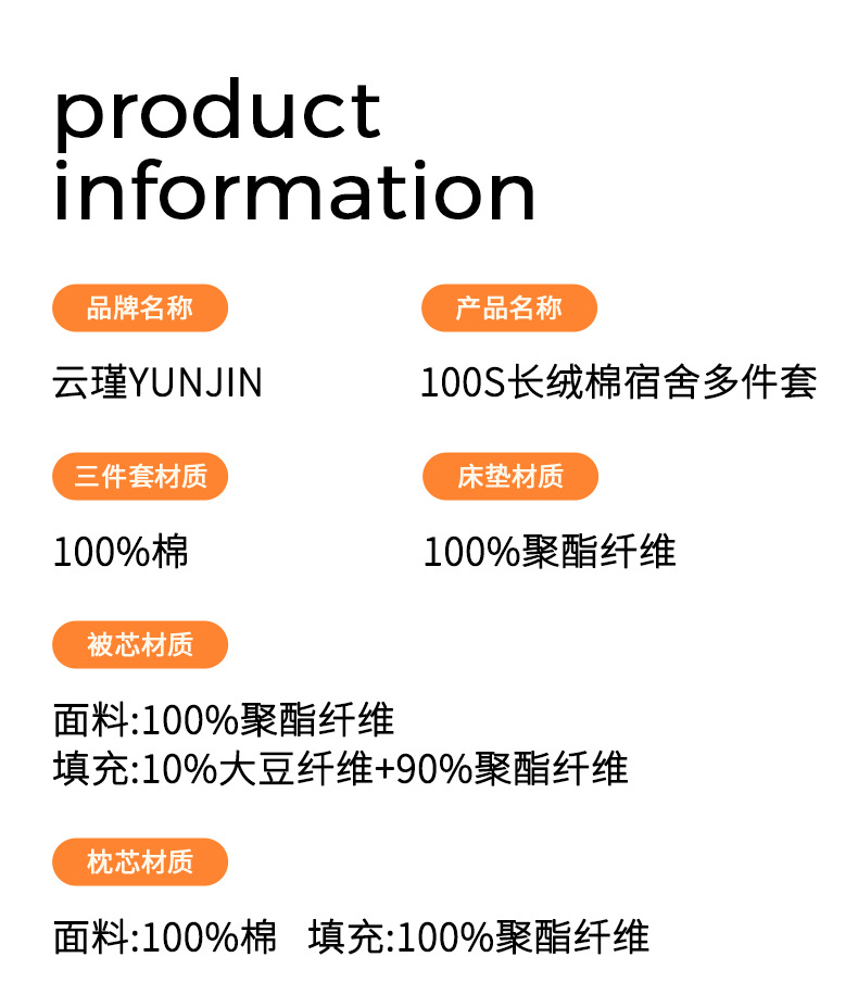 | Especificaciones de tamaño | 床单款:0.9床三件套(被套150x200+床单150x220+枕套),床单款:0.9床春秋丝绵五件套(床单三件套+枕芯+3斤大豆被),床单款:0.9床秋冬丝绵五件套(床单三件套+枕芯+5斤大豆被),床单款:0.9床春秋棉花五件套(床单三件套+枕芯+3斤棉花被),床单款:0.9床秋冬棉花五件套(床单三件套+枕芯+5斤棉花被),床单款:0.9床春秋丝绵六件套(床单三件套+枕芯+3斤大豆被+加厚床垫),床单款:0.9床秋冬丝绵六件套(床单三件套+枕芯+5斤大豆被+加厚床垫),床单款:0.9床春秋棉花六件套(床单三件套+枕芯+3斤棉花被+加厚床垫),床单款:0.9床秋冬棉花六件套(床单三件套+枕芯+5斤棉花被+加厚床垫),床笠款:0.9床三件套(被套150x200+床笠90x190+枕套),床笠款:0.9床春秋丝绵五件套(床笠三件套+枕芯+3斤大豆被),床笠款:0.9床秋冬丝绵五件套(床笠三件套+枕芯+5斤大豆被),床笠款:0.9床春秋棉花五件套(床笠三件套+枕芯+3斤棉花被),床笠款:0.9床秋冬棉花五件套(床笠三件套+枕芯+5斤棉花被),床笠款:0.9床春秋丝绵六件套(床笠三件套+枕芯+3斤大豆被+加厚床垫),床笠款:0.9床秋冬丝绵六件套(床笠三件套+枕芯+5斤大豆被+加厚床垫),床笠款:0.9床春秋棉花六件套(床笠三件套+枕芯+3斤棉花被+加厚床垫),床笠款:0.9床秋冬棉花六件套(床笠三件套+枕芯+5斤棉花被+加厚床垫),床单款:1.2床三件套(被套150x200+床单150x220+枕套),床单款:1.2床春秋丝绵五件套(床单三件套+枕芯+3斤大豆被),床单款:1.2床秋冬丝绵五件套(床单三件套+枕芯+5斤大豆被),床单款:1.2床春秋棉花五件套(床单三件套+枕芯+3斤棉花被),床单款:1.2床春秋棉花五件套(床单三件套+枕芯+5斤棉花被),床单款:1.2床春秋丝绵六件套(床单三件套+枕芯+3斤大豆被+加厚床垫),床单款:1.2床秋冬丝绵六件套(床单三件套+枕芯+5斤大豆被+加厚床垫),床单款:1.2床春秋棉花六件套(床单三件套+枕芯+3斤棉花被+加厚床垫),床单款:1.2床秋冬棉花六件套(床单三件套+枕芯+5斤棉花被+加厚床垫),床笠款:1.2床三件套(被套150x200+床笠120x200+枕套),床笠款:1.2床春秋丝绵五件套(床笠三件套+枕芯+3斤大豆被),床笠款:1.2床秋冬丝绵五件套(床笠三件套+枕芯+5斤大豆被),床笠款:1.2床春秋棉花五件套(床笠三件套+枕芯+3斤棉花被),床笠款:1.2床秋冬棉花五件套(床笠三件套+枕芯+5斤棉花被),床笠款:1.2床春秋丝绵六件套(床笠三件套+枕芯+3斤大豆被+加厚床垫),床笠款:1.2床秋冬丝绵六件套(床笠三件套+枕芯+5斤大豆被+加厚床垫) |