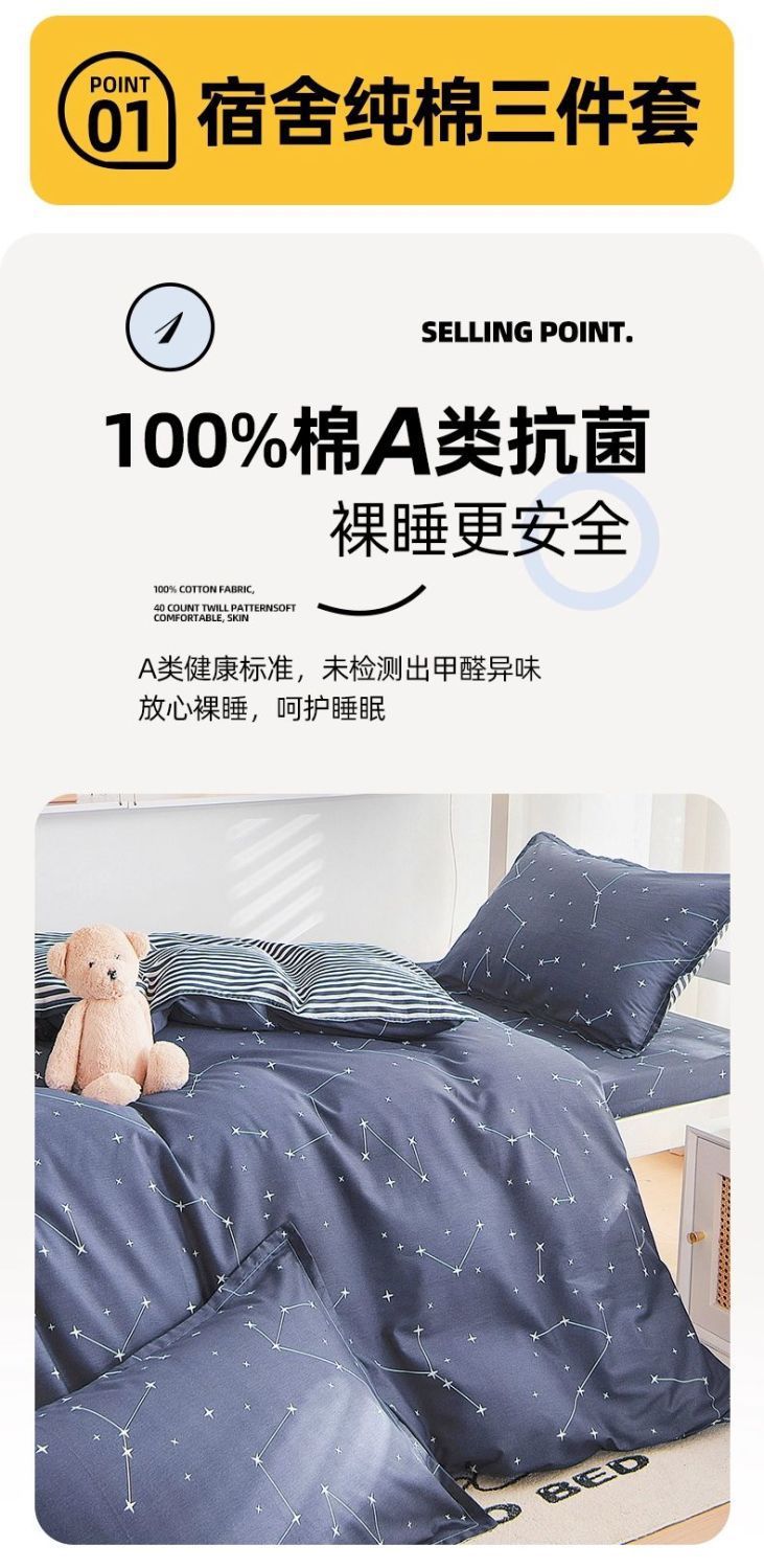 | Especificaciones de tamaño | Primavera y otoño: 0.9 cama cama 0.9 sábanas de cinco piezas juegos "5 jin edredón de soja", 0.9 sábanas de cinco piezas juegos de colchón "colchón grueso sin edredón", primavera y otoño: 0.9 sábanas de ocho piezas juegos "3 jin edredón de soja + colchón de cama", otoño y invierno: 0.9 sábanas de ocho piezas juegos "5 jin edredón de soja + colchón de cama", 0.9 sábanas de nueve piezas juegos de edredón de madre * 2 + colchón de cama |