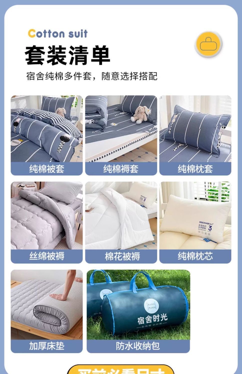 | Especificaciones de tamaño | 0.8 Tres piezas de colchón (conjuntura de colchón 80x190), 0,9 m conjuntura de colchón (cubierta de colchón 90x190), 0,9 m cubierta de colchón de tres piezas (cubierta de colchón 90x200), set de cuatro piezas de colchón de 0,9 m (conjunto de colchón de tres piezas + núcleo de almohada), conjunto de colchón de 0,9 m de cinco piezas (3 <unk> colchón hueco), conjunto de colchón de 0,9 m de cinco piezas (5 <unk> colchón hueco), conjunto de colchón de 0,9 m de seis piezas (3 kg de colchón hueco + 3 kg de colchón), 0,9 m de colchón conjunto de 6 piezas (5 jin colchón hueco + 3 jin colchón), set de colchón de 0,9 m de colchón de seis piezas (3 jin colchón hueco + colchón), set de colchón de 0,9 m de colchón de seis piezas (5 jin colchón hueco + colchón), set de colchón de 1,2 m de tres piezas (set de colchón 120x200), set de colchón de 1,2 m de cuatro piezas (set de colchón de tres piezas + núcleo de colchón), set de colchón de 1,2 m de seis piezas (3 jin colchón hueco + 3 jin colchón), set de colchón de 1,2 m de seis piezas (5 jin colchón hueco + 3 jin colchón) |
