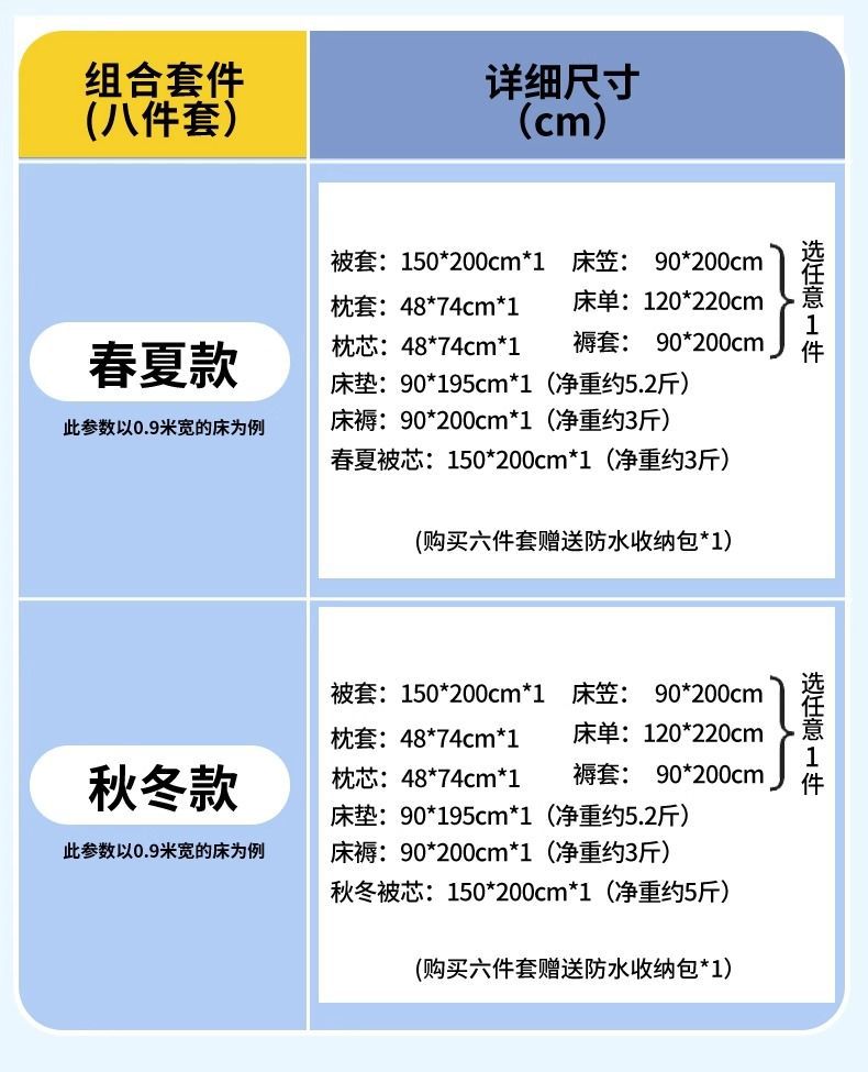 | Especificaciones de tamaño | Sábanas de 0,9 metros de cama de tres piezas [colcha de colcha + sábanas + funda de almohada], cama de 0,9 metros de cama de tres piezas [colcha de colcha + funda de colcha + funda de almohada], cama de 0,9 metros de cama de tres piezas [colcha de colcha + funda de colcha + funda de almohada], cama de 0,9 metros de cama de cuatro piezas [conjunto de tres piezas + núcleo de almohada], cama de 0,9 metros de primavera y otoño de cinco piezas [conjunto de cuatro piezas + 3 <unk> colcha de algodón], cama de 0,9 metros de otoño y invierno de cinco piezas [conjunto de cuatro piezas + 5 <unk> colcha de algodón], 0.9 sábanas de primavera y otoño seis piezas conjuntos [conjunto de cinco piezas + 3 kg de algodón de seda], 0.9 sábanas de otoño y invierno seis piezas conjuntos [conjunto de cinco piezas + 3 kg de algodón de seda] |