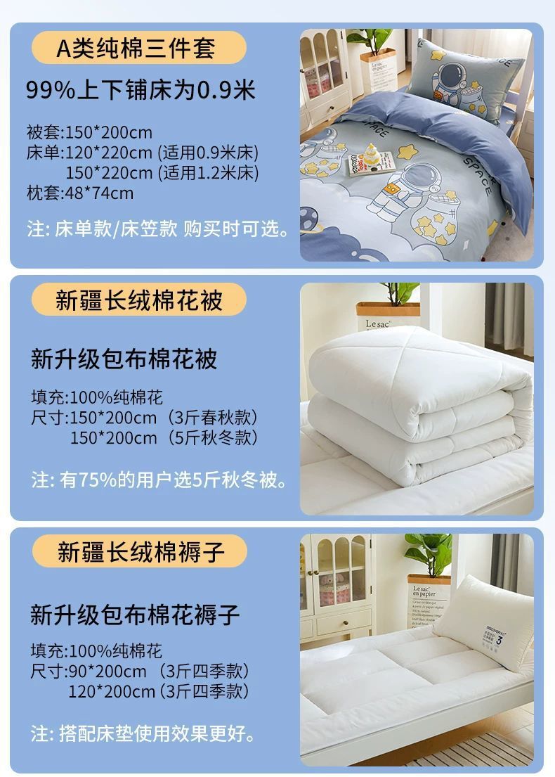 Dormitorio de estudiantes Ropa de cama de tres piezas de algodón puro Ropa de cama de algodón Funda de edredón Colchón individual Juego de cuatro piezas Seis