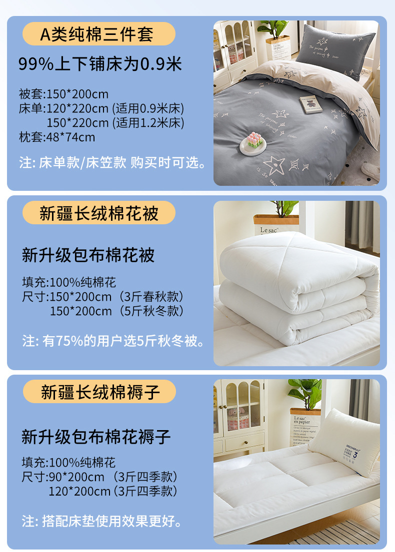 Dormitorio de estudiantes universitarios algodón conjunto de colcha de tres piezas un conjunto completo de sábanas de algodón una sola colcha de cama seis piezas