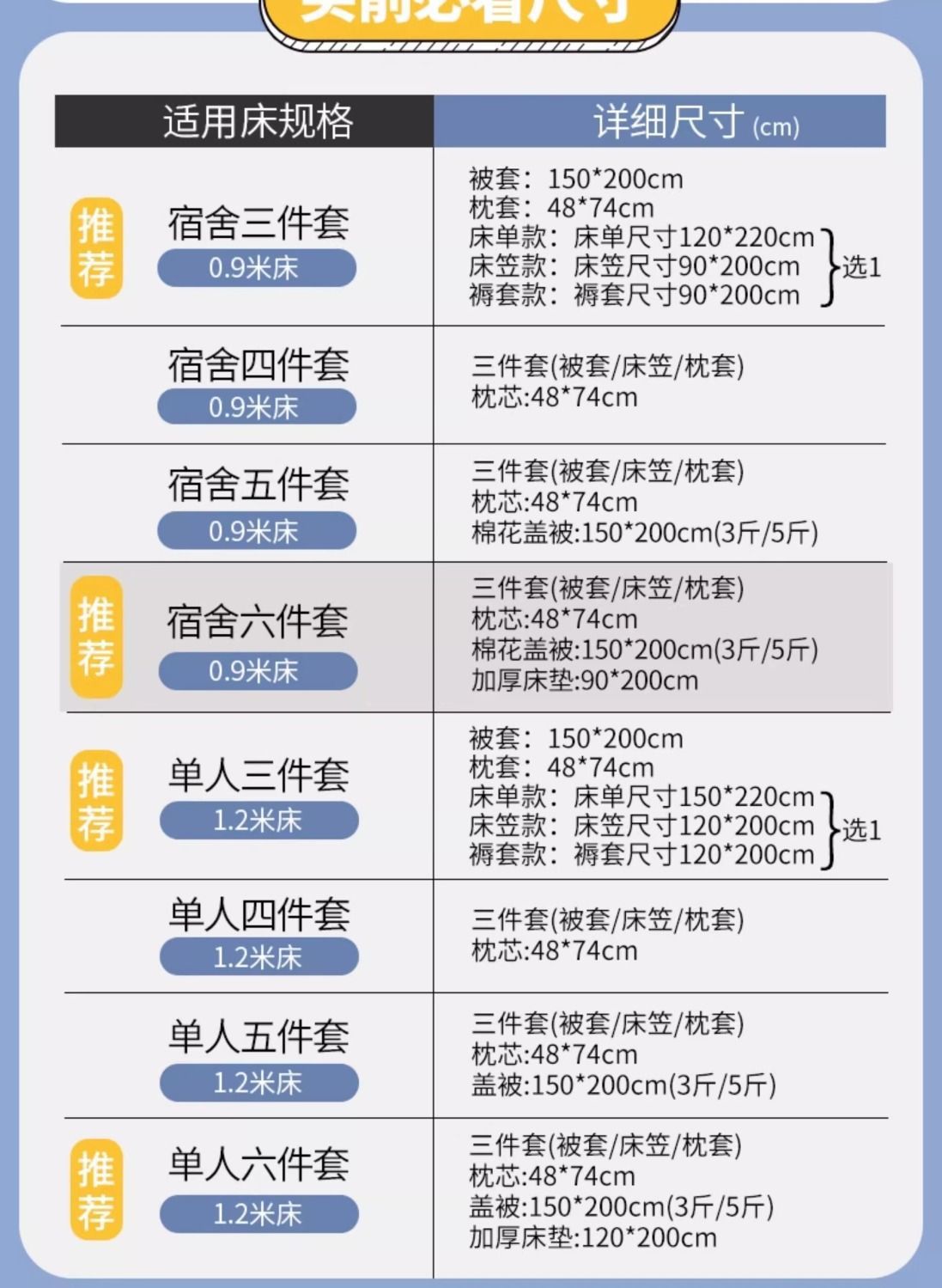 | Especificaciones de tamaño | Juego de tres piezas de cama de 0,8 m [80x190],Sombrilla de cama de 0,9 m de tres piezas [Sombrilla de cama 90x200],Juego de sábanas de tres piezas de 0,9 m [sábanas 120x220],Juego de tres piezas para colchones de 0,9 m [juego de colchones 90x200],Juego de cama de cuatro piezas (juego de almohada de cama de tres piezas 90x200),Juego de colchón de cinco piezas (colchón grueso con núcleo de almohada de tres piezas con sábana),Juego de cinco piezas (3 kg de edredón de soja con núcleo de almohada de tres piezas de sábana 0.9),Juego de cinco piezas (edredón de soja de 5 kg con núcleo de almohada de tres piezas de sábana 0.9),Juego de seis piezas (colchón de edredón de soja de tres piezas con núcleo de almohada de 3 kg),Juego de seis piezas (colchón de edredón de soja de cinco kg con núcleo de almohada de tres piezas),Juego de seis piezas (colchón de edredón de algodón de 3 kg con núcleo de almohada de tres piezas),Juego de seis piezas (colchón de edredón de algodón de 5 kg con núcleo de almohada de tres piezas),Juego de siete piezas de edredón para niños y madres (2 piezas de edredón de soja para colchones de cinco piezas) |