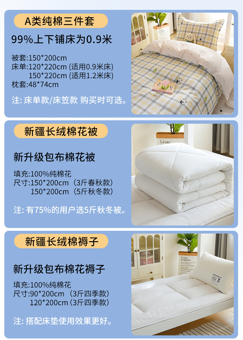 Juego de tres piezas de ropa de cama para dormitorios de estudiantes universitarios, sábanas de algodón de algodón, edredón, un juego completo de seis piezas