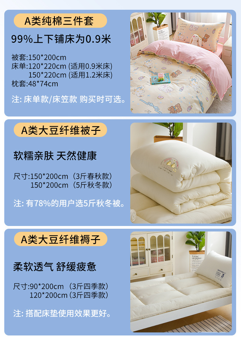 dormitorio de estudiantes de algodón de tres piezas cama