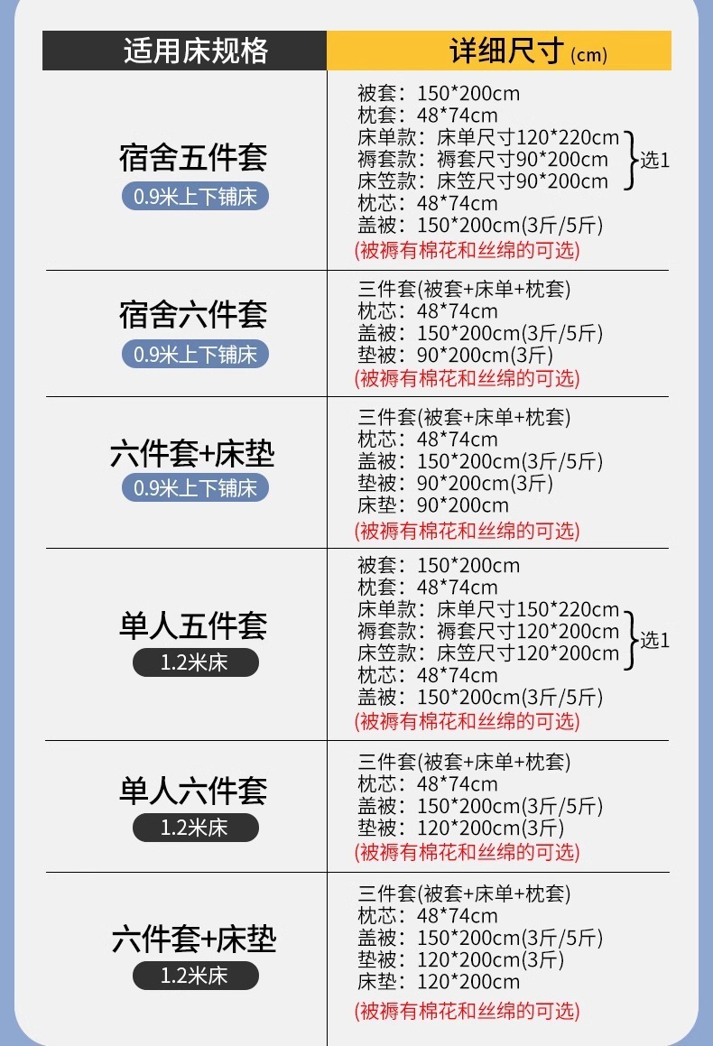 | Especificaciones de tamaño | 0,9m cama de tres piezas (colcha de cama + sábanas + colcha de almohada), set de cuatro piezas de cama de 0,9 m (set de tres piezas + núcleo de almohada), set de cinco piezas de primavera y otoño de 0,9 m (3 kg edredón), set de cinco piezas de otoño y invierno de 0,9 m (5 kg edredón), set de seis piezas de primavera y otoño de 0,9 m (3 kg edredón + 3 kg edredón), set de seis piezas de otoño y invierno de 0,9 m (3 kg edredón + 5 kg edredón), set de cinco piezas de cama de 0,9 m (3 kg edredón de seda), set de cinco piezas de cama de 0,9 m (4.5 jin edredón de seda), 0,9 set de seda de seis piezas (3 jin cubierta + 3 jin cojín), 0,9 set de seda de seis piezas (4.5 <unk> cubierta + 3 <unk> cojín, 1,2 m cama de tres piezas (cubierta + sábanas + funda de almohada), 1,2 m cama de cuatro piezas (cubierta de tres piezas + núcleo de almohada), 1,2 m primavera y otoño de cinco piezas (cubierta de algodón 3 <unk>), 1,2 m otoño y invierno de cinco piezas (cubierta de algodón 5 <unk>), 1,2 m primavera y otoño de seis piezas (cubierta de 3 <unk> + 3 <unk>), 1,2 m otoño y invierno de seis piezas (cubierta de 3 <unk> + 5 <unk>), 1,2 m cama de cinco piezas (cubierta de seda 3 <unk>), 1.2m cama de cinco piezas (4,5 jin edredón de seda), 1.2 seda de seis piezas (3 jin cubierta + 3 jin cojín), 1.2 seda de seis piezas de conjunto (4,5 jin cubierta + 3 jin cojín |