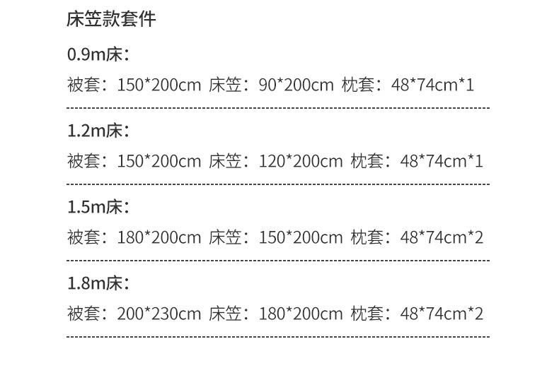 | Especificaciones de tamaño | Juego de cama de tres piezas de 0,9 m [funda de edredón 150*200,Juego de cama de tres piezas de 1,2 m [funda de edredón 150*200,1.35 juego de cama de tres piezas [funda de edredón 150*200,Juego de cama de cuatro piezas de 1,5 m [funda de edredón 180*200,Juego de cuatro piezas de cama de 1,8 m [funda de edredón 200*230,Juego de cuatro piezas de cama de 2.0m [funda de edredón 220*240,0.9 Juego de sábanas de tres piezas [funda de edredón 150*200,1.2 Juego de sábanas de tres piezas [funda de edredón 150*200,1.35 funda de edredón de tres piezas con sábana 150*200,Juego de cama de cuatro piezas 1.5 [funda de edredón 180*200,Juego de cama de cuatro piezas 1.5 [funda de edredón 200*230,1.8 Juego de sábanas de cuatro piezas [funda edredón 200*230,Juego de cuatro piezas de cama 2.0 [funda de edredón 220*240 |