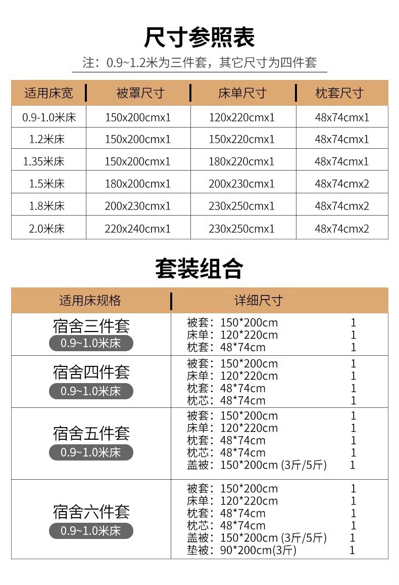 | Especificaciones de tamaño | Sábanas de cama de 0,9 m con tres piezas (colcha de colcha + sábanas + funda de almohada), cama de 0,9 m cama de tres piezas (colcha de colcha + cama + funda de almohada), sábanas de 1.2m cama con tres piezas (cucha + sábanas + funda de almohada), [conjunto de cuatro piezas de cama de 1,5 metros] adecuado para el núcleo de edredón de 180x200cm, [conjunto de cuatro piezas de cama de 1,8 metros] adecuado para el núcleo de edredón de 200x230cm, [conjunto de cuatro piezas de cama de 2.0 metros] adecuado para el núcleo de edredón de 220x240cm, conjunto de cuatro piezas de cama de 0,9 metros [cucha + sábanas + funda de almohada + núcleo de almohada], conjunto de cinco piezas de cama de 0,9 metros [conjunto de tres piezas + núcleo de almohada + edredón de 3 kg], Sábanas de 0,9 m de cama otoño y invierno cinco piezas conjunto [conjunto de tres piezas + núcleo de almohada + 5 <unk> edredón], sábanas de 0,9 m de cama primavera y otoño seis piezas conjunto [conjunto de tres piezas + núcleo de almohada + 3 <unk> edredón + 3 <unk> colchón] para enviar paquetes de almacenamiento, sábanas de 0,9 m de cama otoño y invierno seis piezas conjunto [conjunto de tres piezas + núcleo de almohada + 5 <unk> edredón + 3 <unk> colchón] para enviar paquetes de almacenamiento, sábanas de cama de 0,9 m de cama primavera y otoño seis piezas conjunto [conjunto de tres piezas + núcleo de almohada + 3 <unk> edredón + 3 <unk> colchón] para enviar paquetes de almacenamiento, Cama de cama de 0.9m otoño y invierno seis piezas [conjunto de tres piezas + núcleo de almohada + 5 <unk> edredón + 3 <unk> colchón] bolsa de almacenamiento |