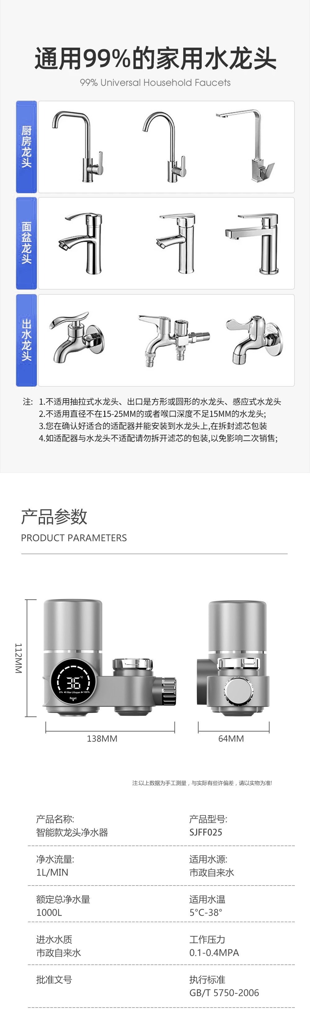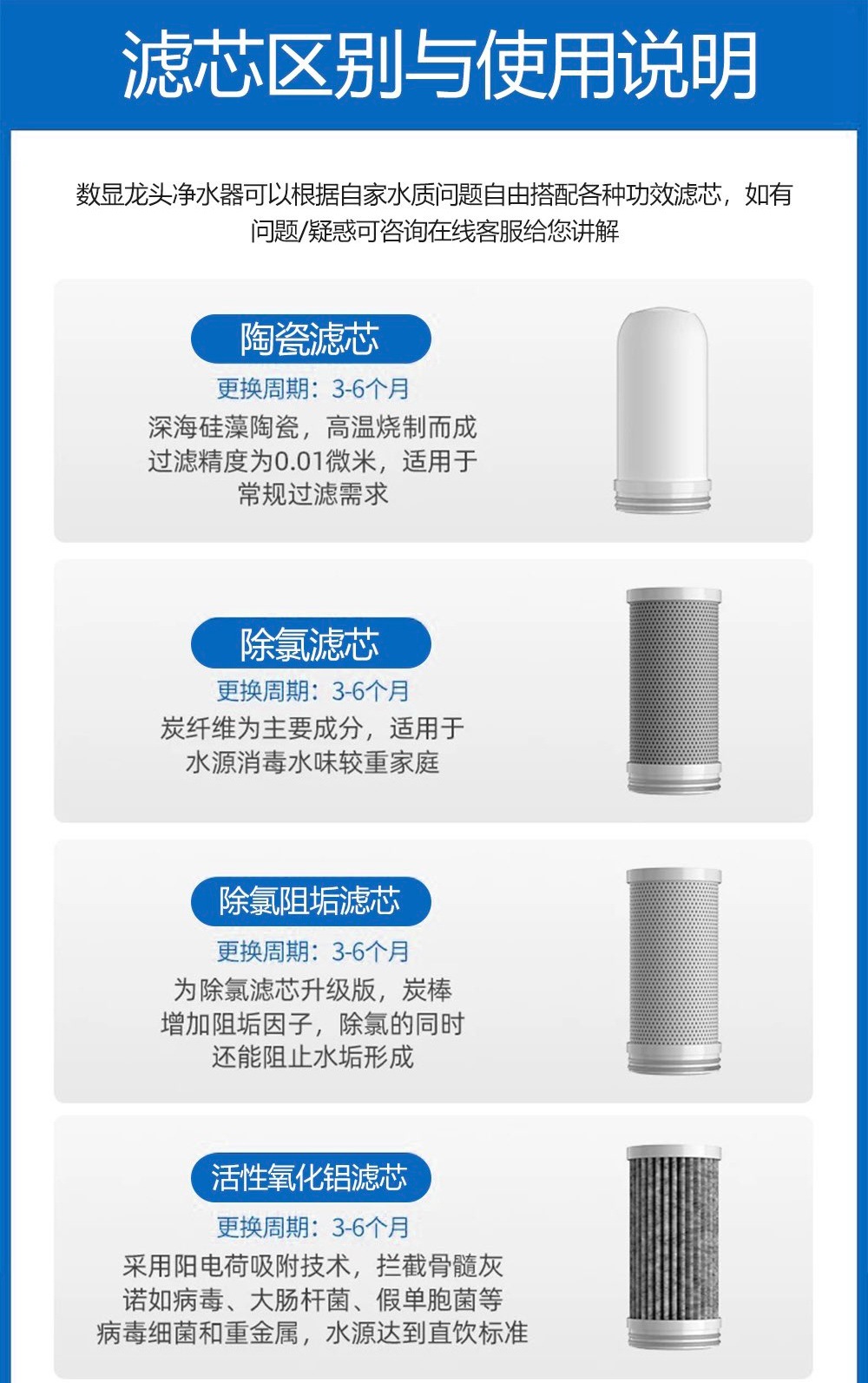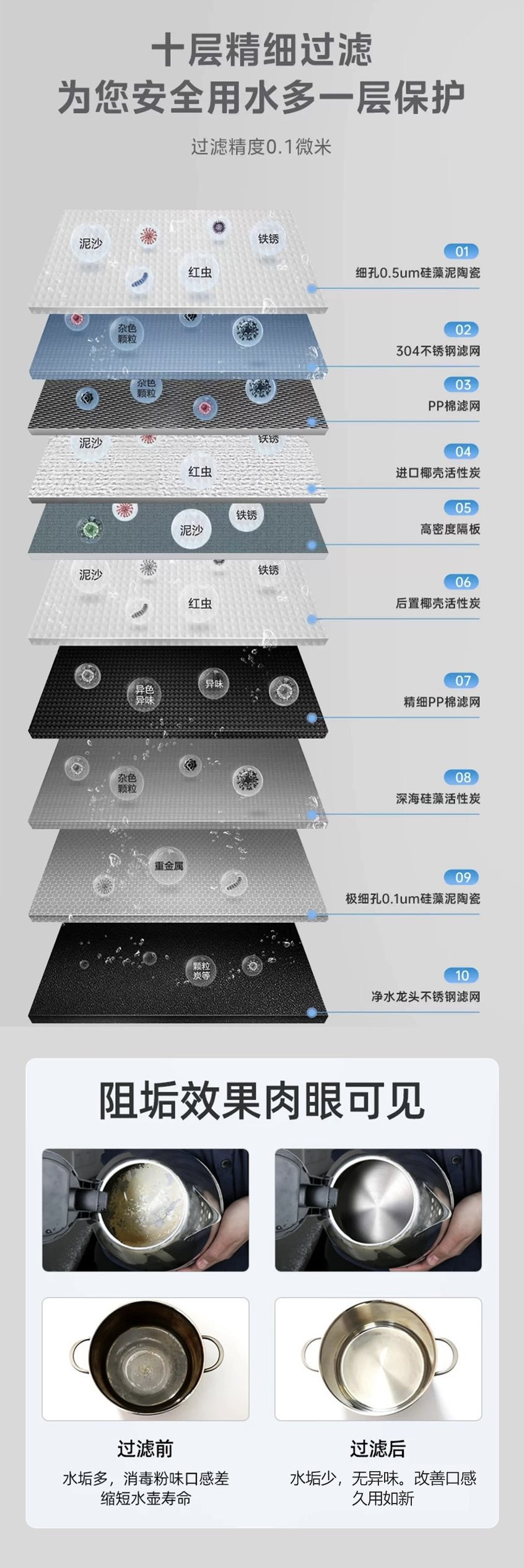 | Efectos de purificación de agua | eliminación de escala, eliminación de cloro, eliminación de metales pesados, eliminación de óxido, eliminación de sedimentos |