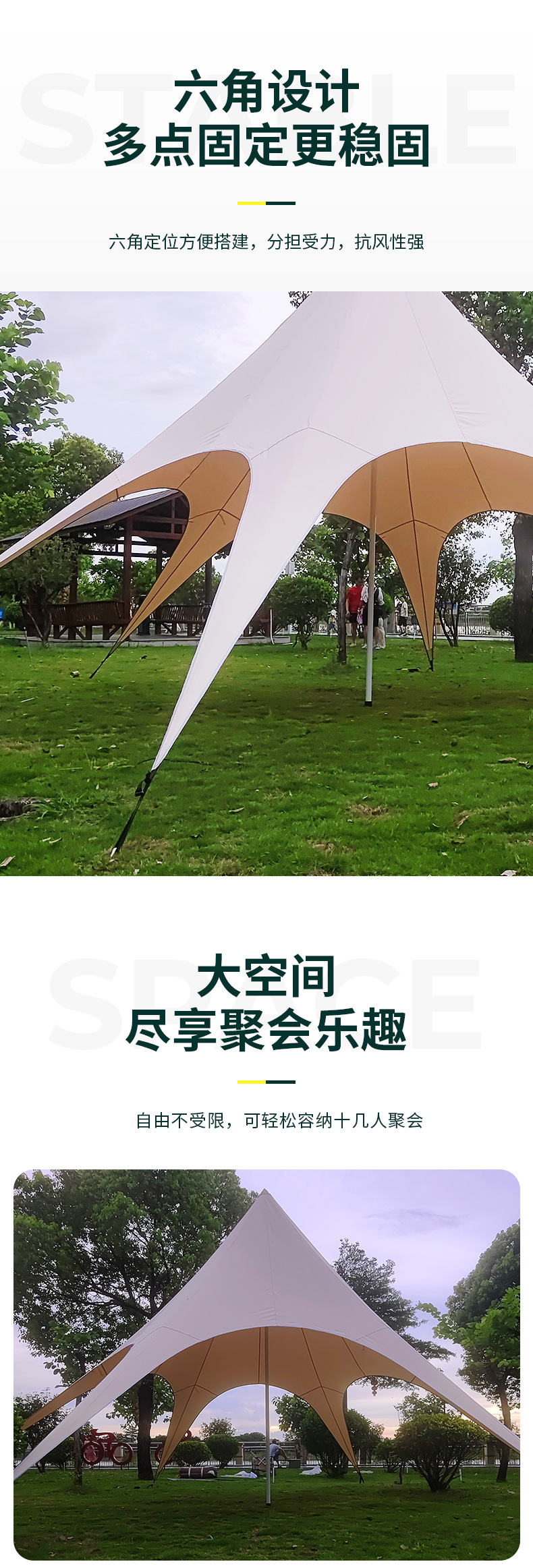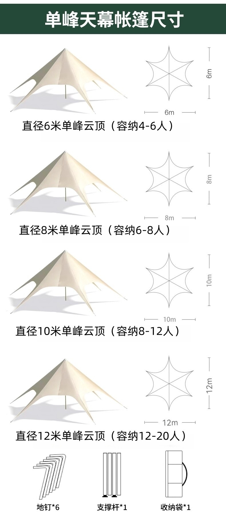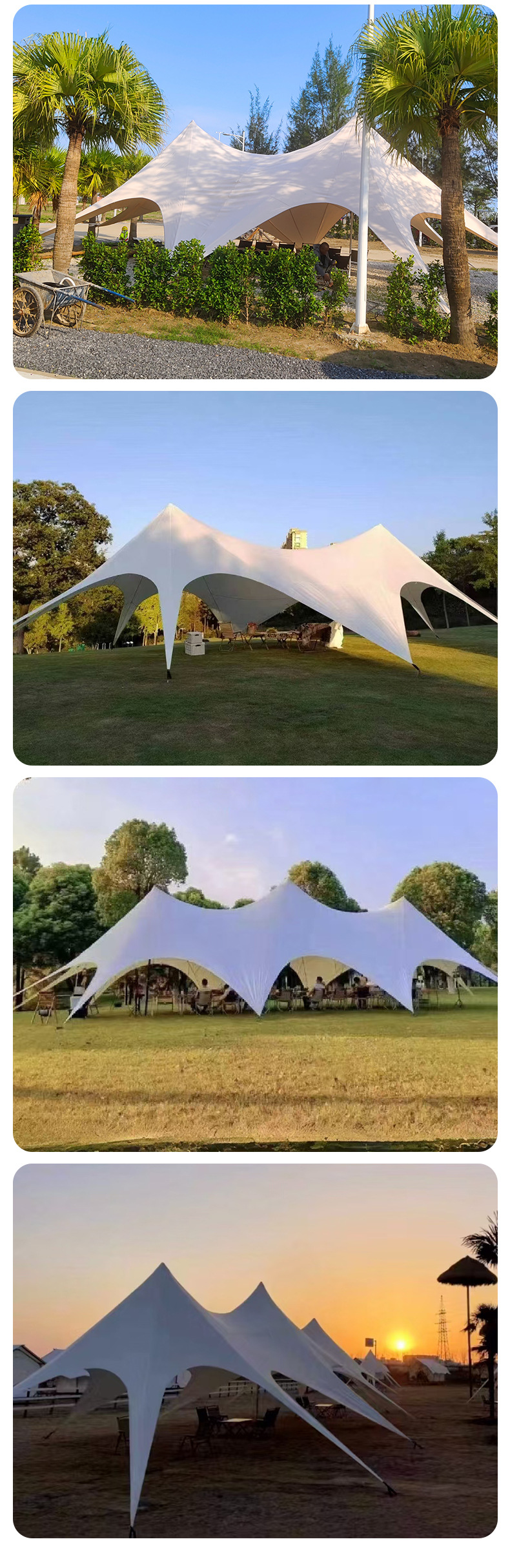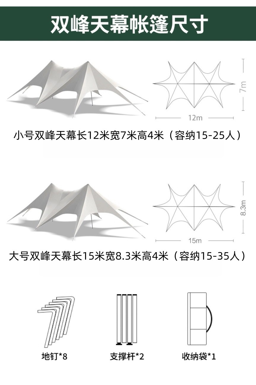 | Tamaño | 6 * 6 * 3 metros de cortina de cielo de pico único, 8 * 8 * 4 metros de cortina de cielo de pico único, 10 * 10 * 4 metros de cortina de cielo de pico único, 12 * 12 * 5 metros de cortina de cielo de pico único, 12 * 7 * 4 metros de pico doble pequeño, 15 * 8,3 * 4 metros de pico doble grande, 20 * 8,6 * 4 metros de pico triple |