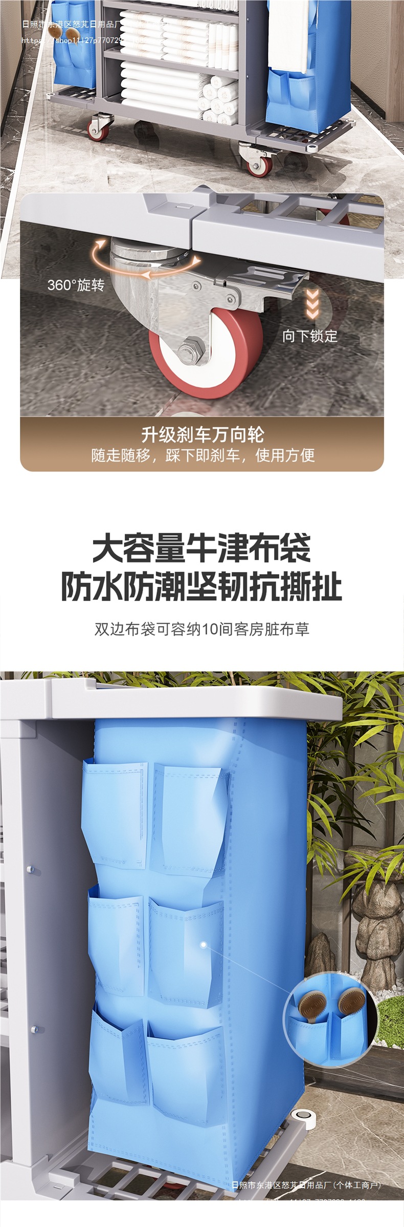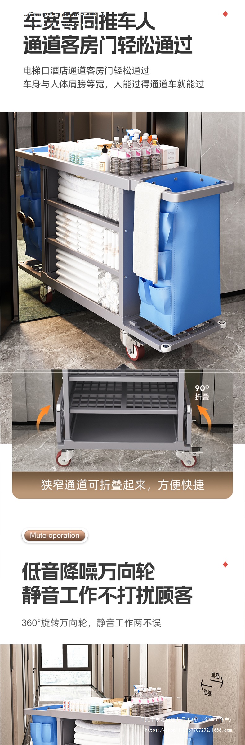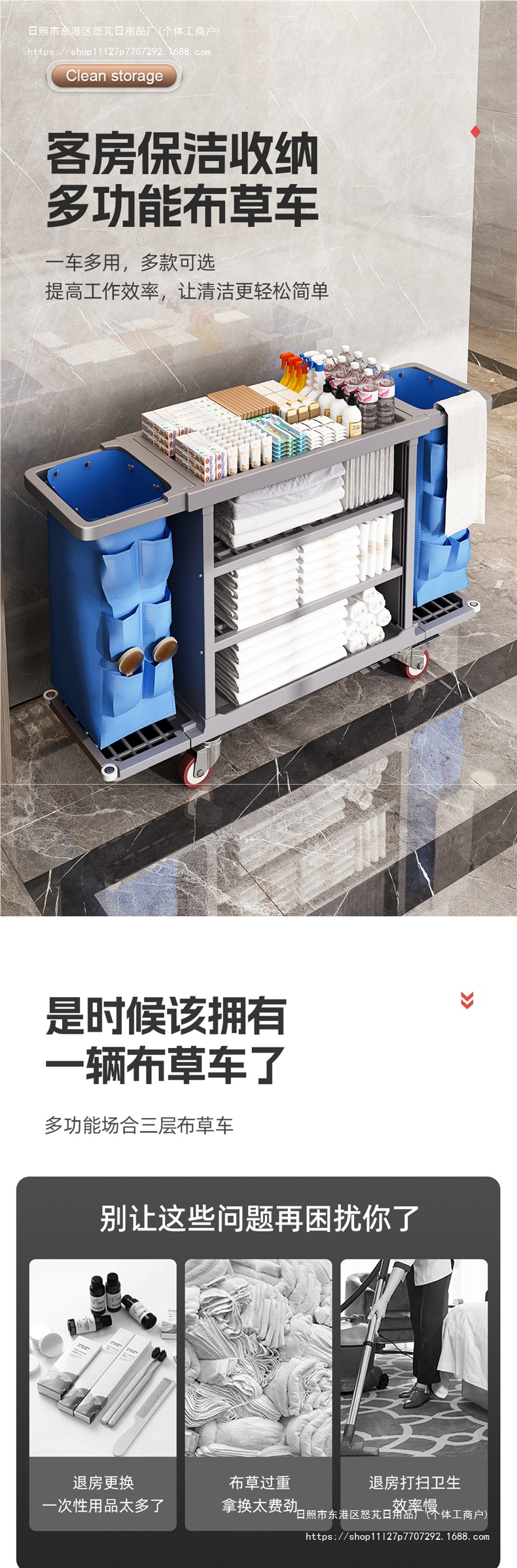 Carrito de limpieza de paña de habitación multifuncional de tres pisos móviles con ruedas de limpieza de hotel carrito de herramientas