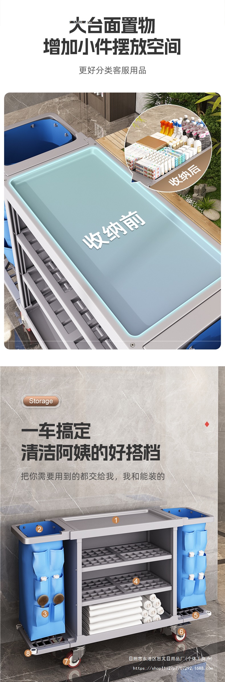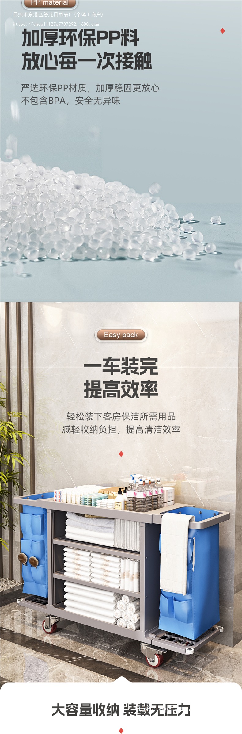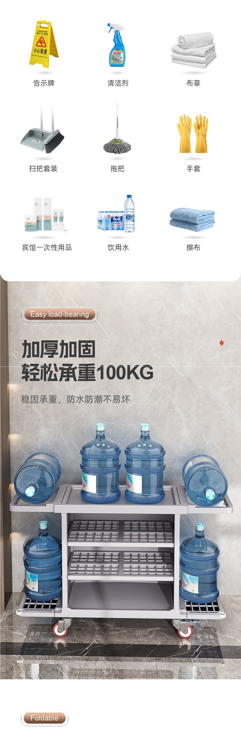 Carrito de limpieza de paña de habitación multifuncional de tres pisos móviles con ruedas de limpieza de hotel carrito de herramientas