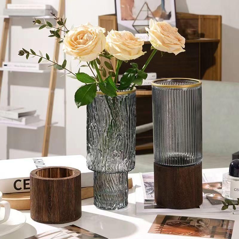 Florero de vidrio con soporte de madera de lujo ligero, decoración de flores hidropónicas, sala de estar de bambú rico, decoración de arreglos florales al por mayor
