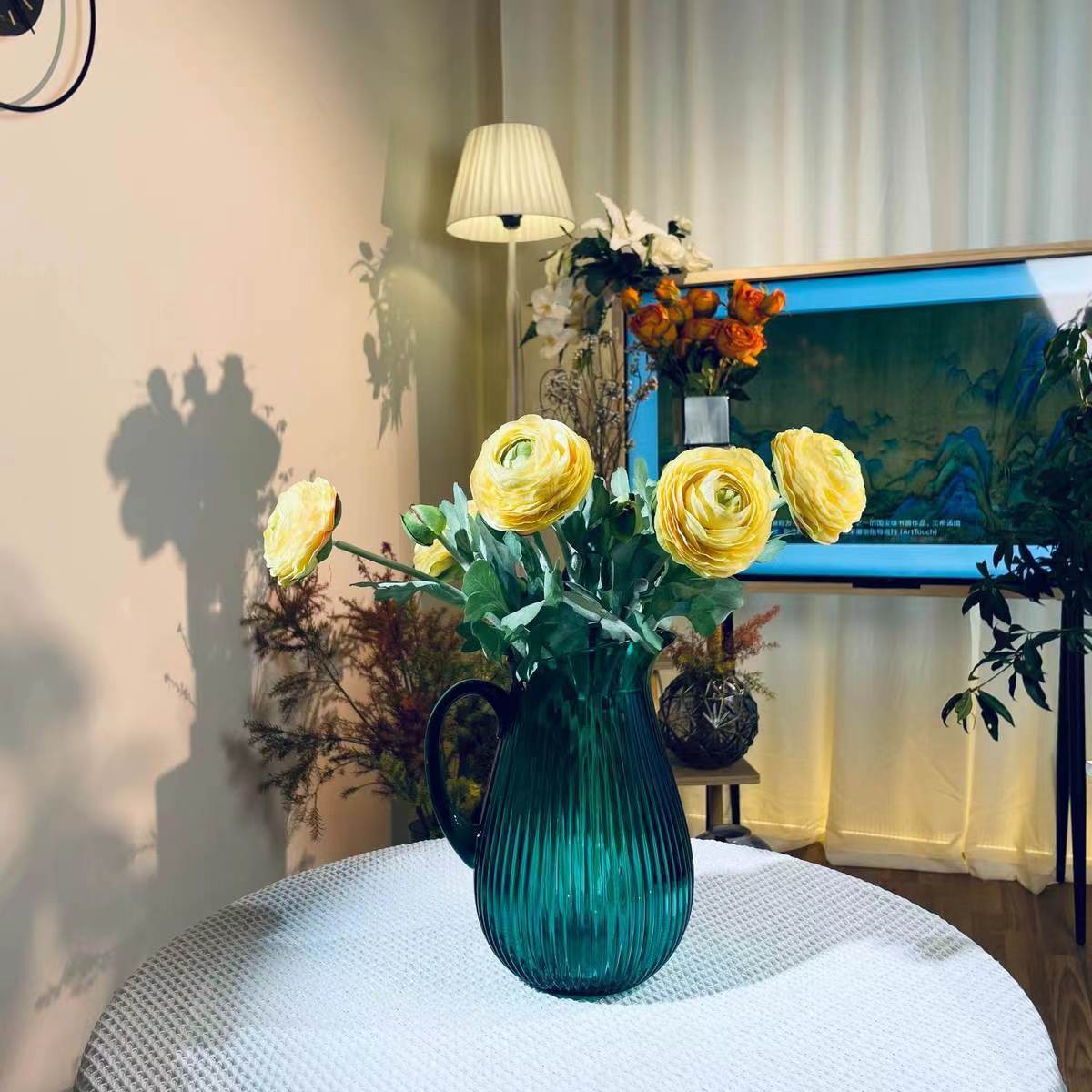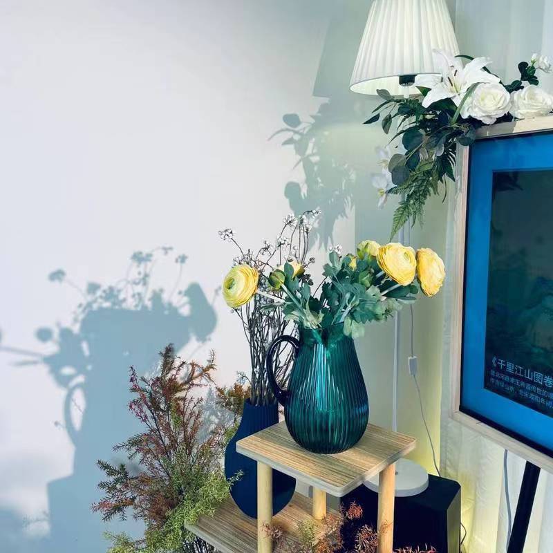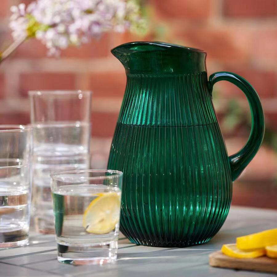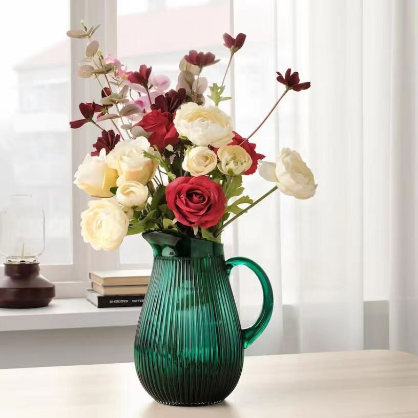 Alta sensación de exportación verde esmeralda con mango tetera tetera de agua fría vasija de vidrio lirio ornamentos de flores
