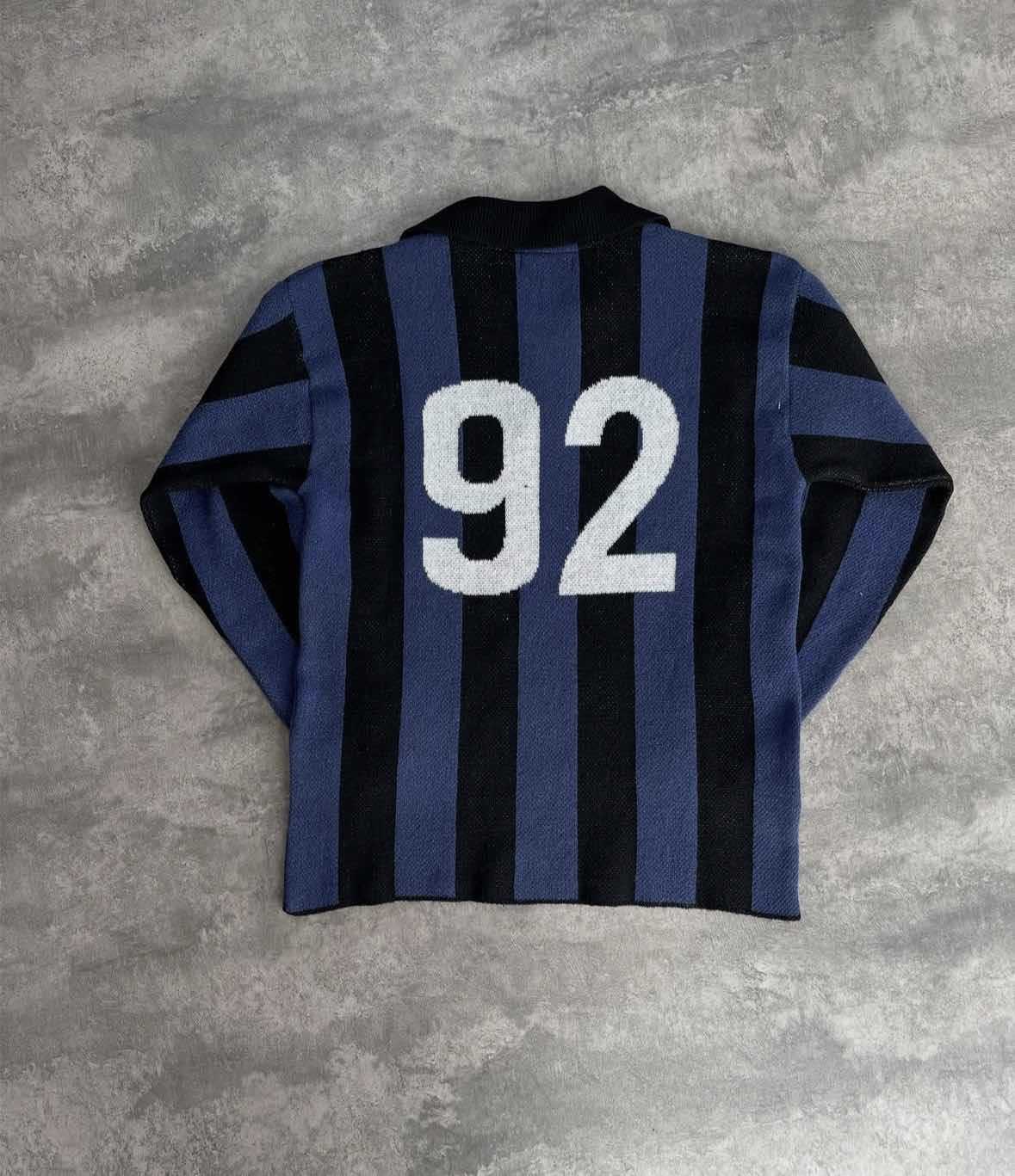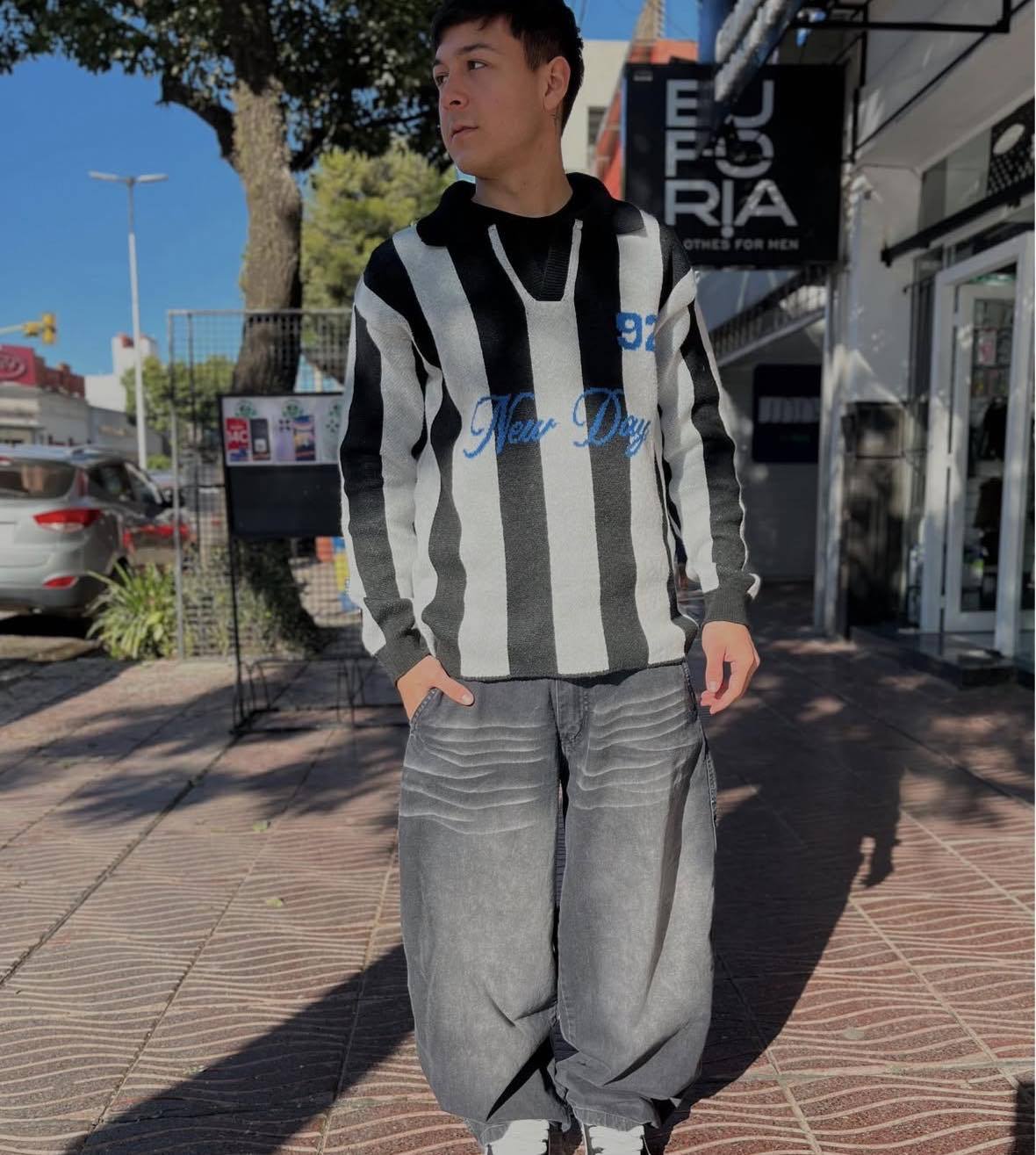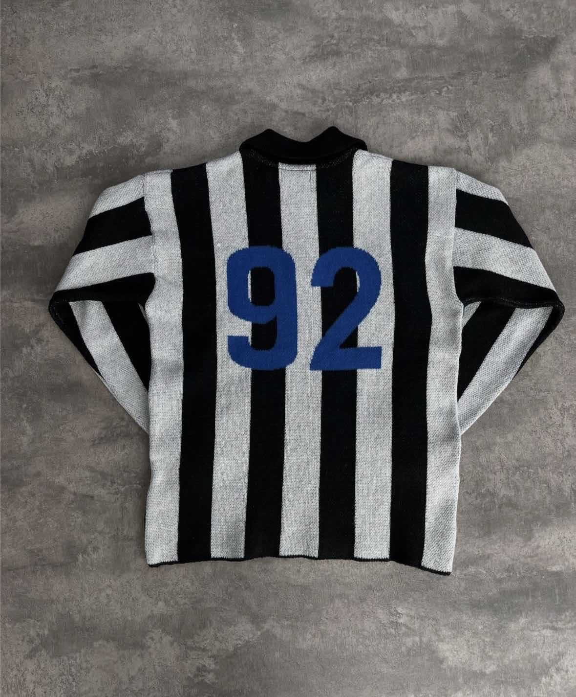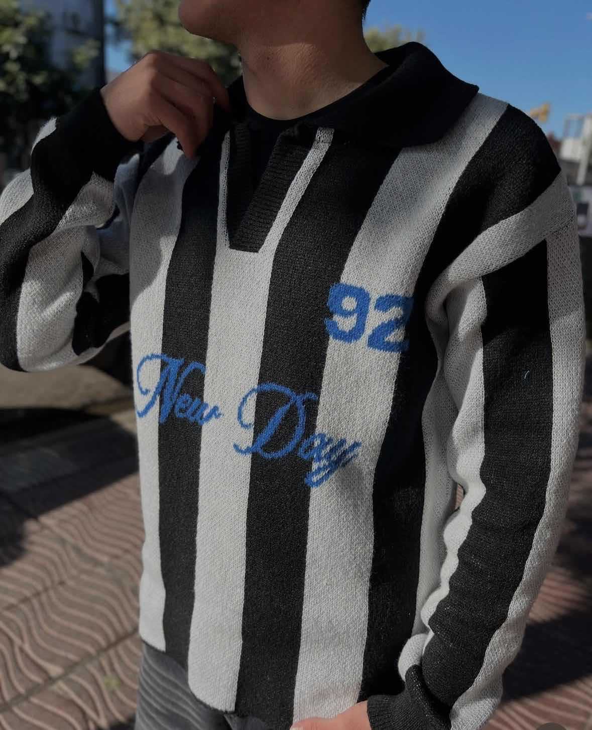 Suéter de punto estilo jersey retro americano con rayas verticales para hombre y mujer, con estampado de letras y cuello tipo polo, Otoño/Invierno 2025.