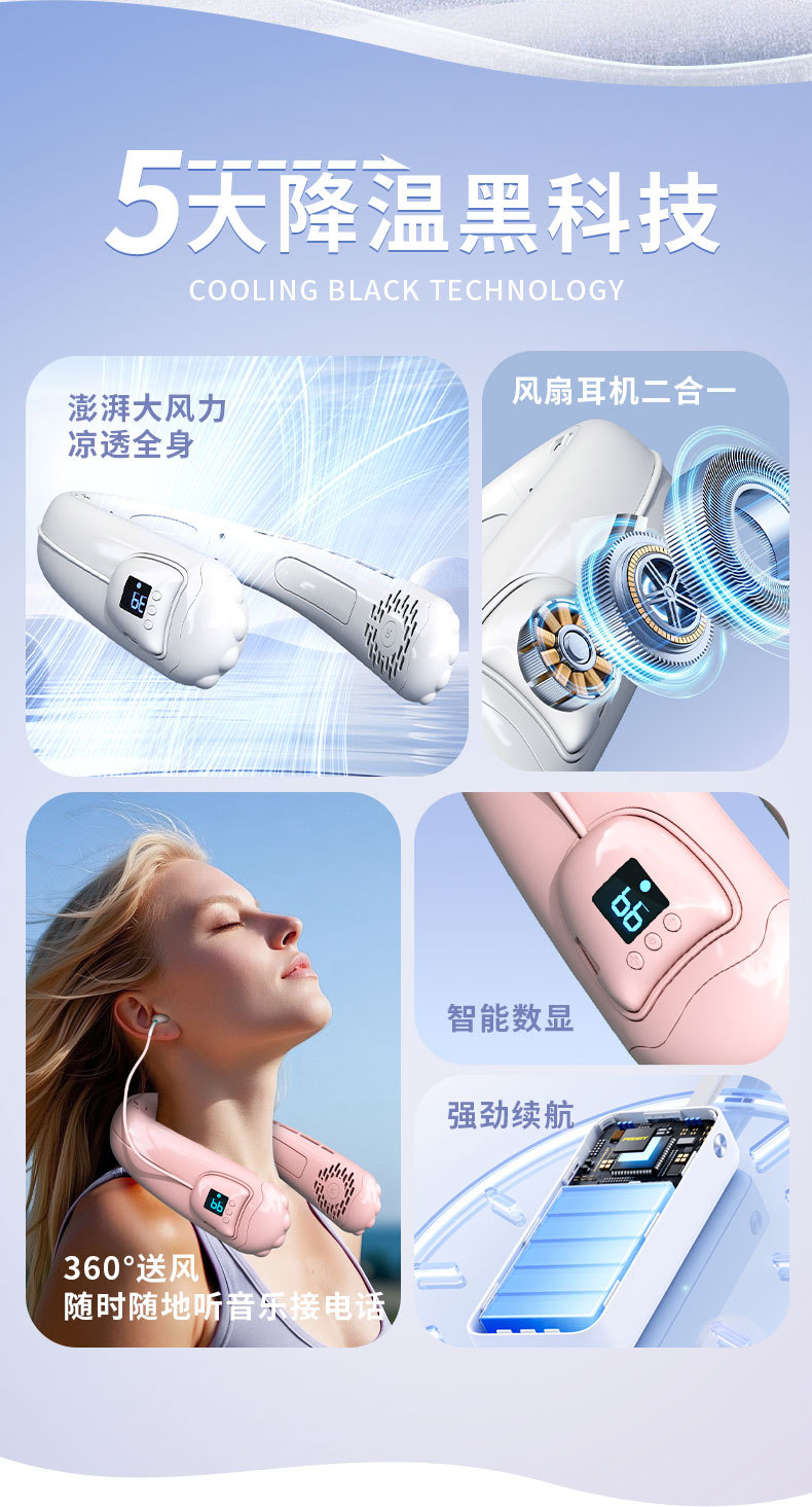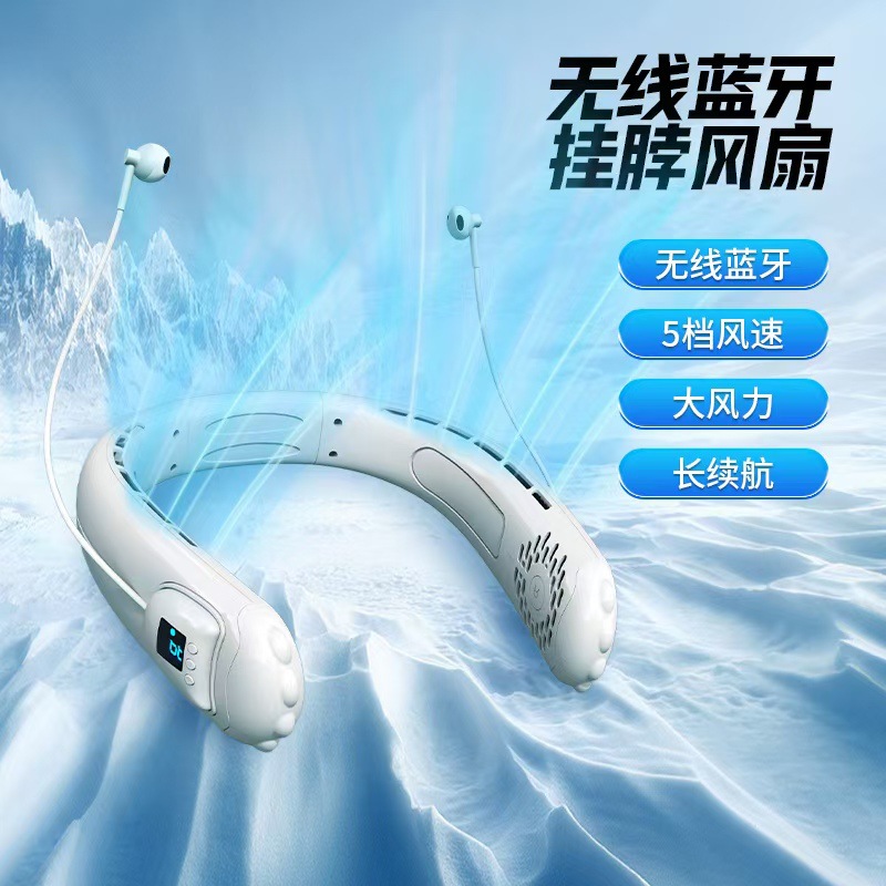 Nuevo ventilador de cuello colgante Bluetooth inalámbrico transfronterizo, carga usb, portátil para el hogar, batería larga al aire libre, ventilador deportivo pequeño