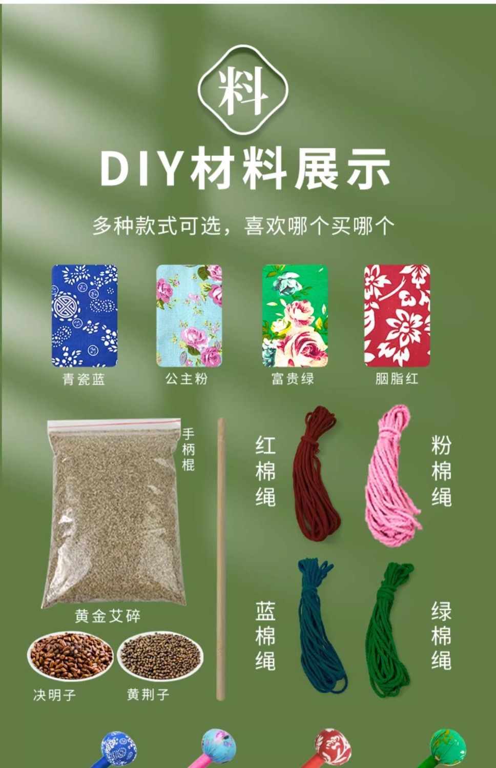 | Color | Azul celadón, polvo de princesa, carmín, verde rico, amarillo monarca, años de oro - con borlas, cien bendiciones rojas - con borlas, verde azulgrana - con borlas, polvo de ciruela de acacia - con borlas, azul de ciruela de acacia - con borlas, belleza de bambú púrpura - con borlas borlas, satén de seda verde - con borlas, amarillo puro de seda real, caqui Ruyi |